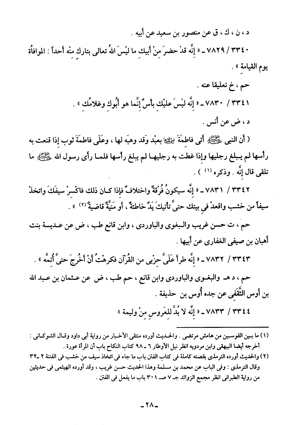 3342/ 7831 - "إِنَّه سيكونُ فُرْقةٌ واختلافٌ فإِذا كان ذلك فاكْسِرْ سيفَكَ واتخذْ سيفًا من خشب واقعدْ فِى بيتك حتَّى تأتيكَ يَدٌ خاطئةٌ، أو مَنيَّةٌ قاضيةٌ (¬2) ".