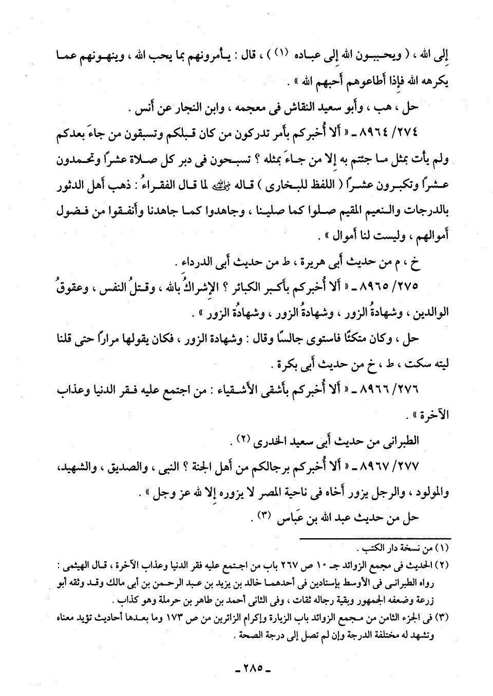 275/ 8965 - "أَلا أُخبركم بأَكبر الكبائر؟ الإِشراكُ باللَّه، وقتلُ النفس، وعقوقُ الوالدين، وشهادةُ الزور، وشهادةُ الزور، وشهادُة الزور".