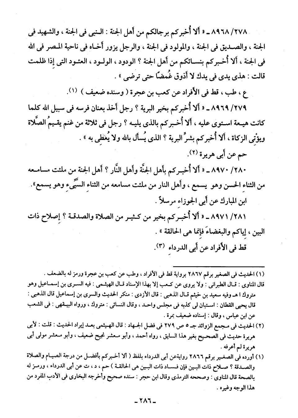 (¬3) أورده في الصغير برقم 2866 رواية عن أبى الدرداء بلفظ (ألا أخبركم بأفضل من درجة الصيام والصلاة والصدقة؟ صلاح ذات البين فإن فساد ذات البين هى الحالقة) حم، د، ت عن أبى الدرداء، ورمز له بالصحة قال المناوى: وصححه الترمذى وقال ابن حجر: سنده صحيح وأخرجه البخارى في الأدب المفرد من هدا الوجه وغيره.