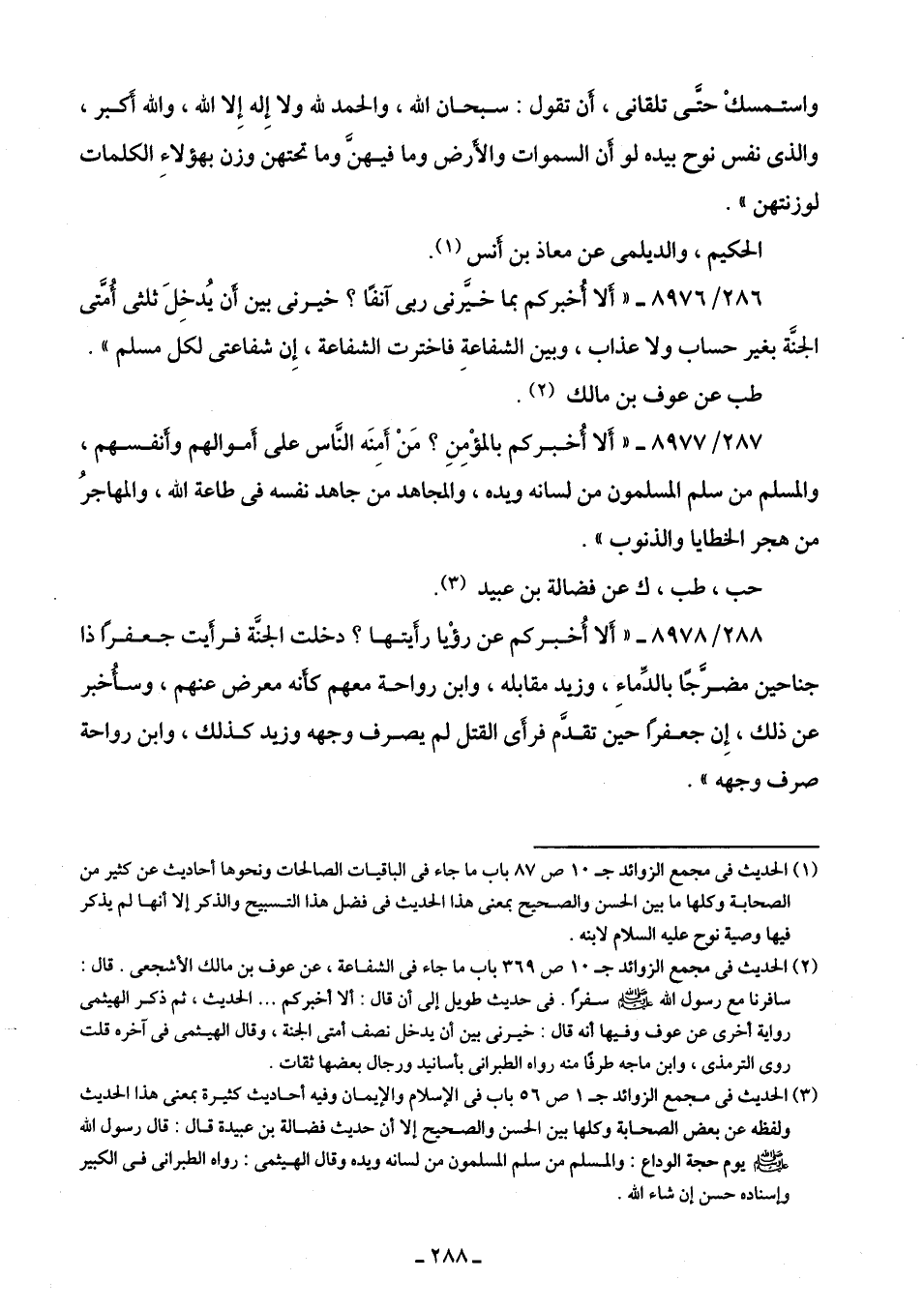 287/ 8977 - "أَلا أُخبركم بالمؤْمِنِ؟ مَنْ أمِنَه النَّاس على أَموالهم وأَنفسهم، والمسلم من سلم المسلمون من لسانه ويده، والمجاهد من جاهد نفسه في طاعة اللَّه، والمهاجرُ من هجر الخطايا والذنوب".