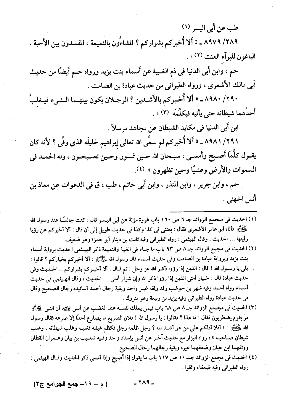 289/ 8979 - "أَلا أُخبركم بشراركم؟ المشاءُون بالنميمة، المفسدون بين الأَحبة، الباغون للبرآءِ العنت (¬2) ".