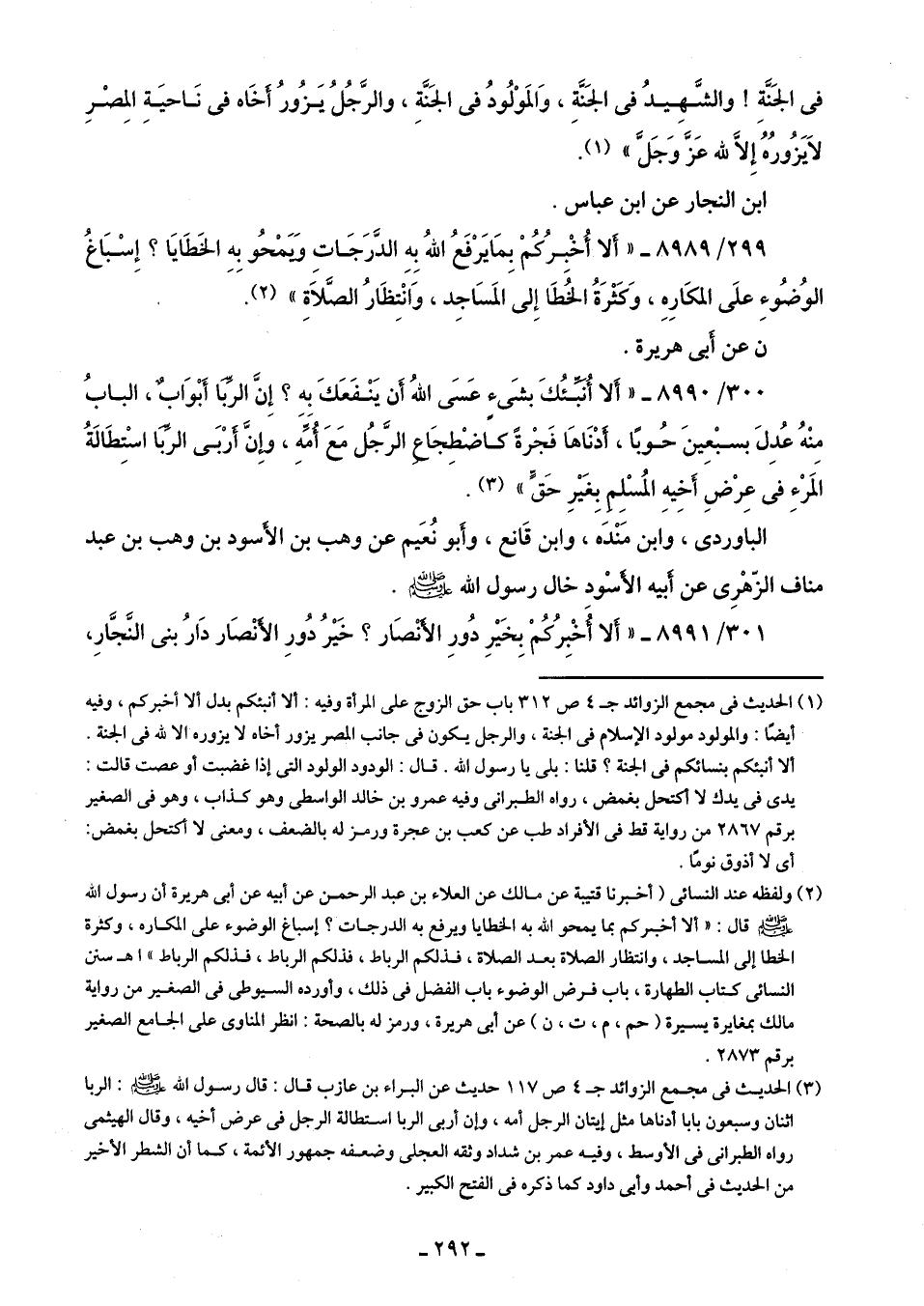 299/ 8989 - "أَلا أُخْبِرُكُمْ بِمَا يَرْفَعُ اللَّهُ بِهِ الدَّرَجَاتِ وَيَمْحُو بِهِ الخَطَايَا؟ إِسْبَاغُ الوُضُوءِ علَى المَكَارِهِ، وَكثْرَةُ الخُطَا إِلى المَسَاجِد، وَانْتِظَارُ الصَّلَاةِ" (¬2).