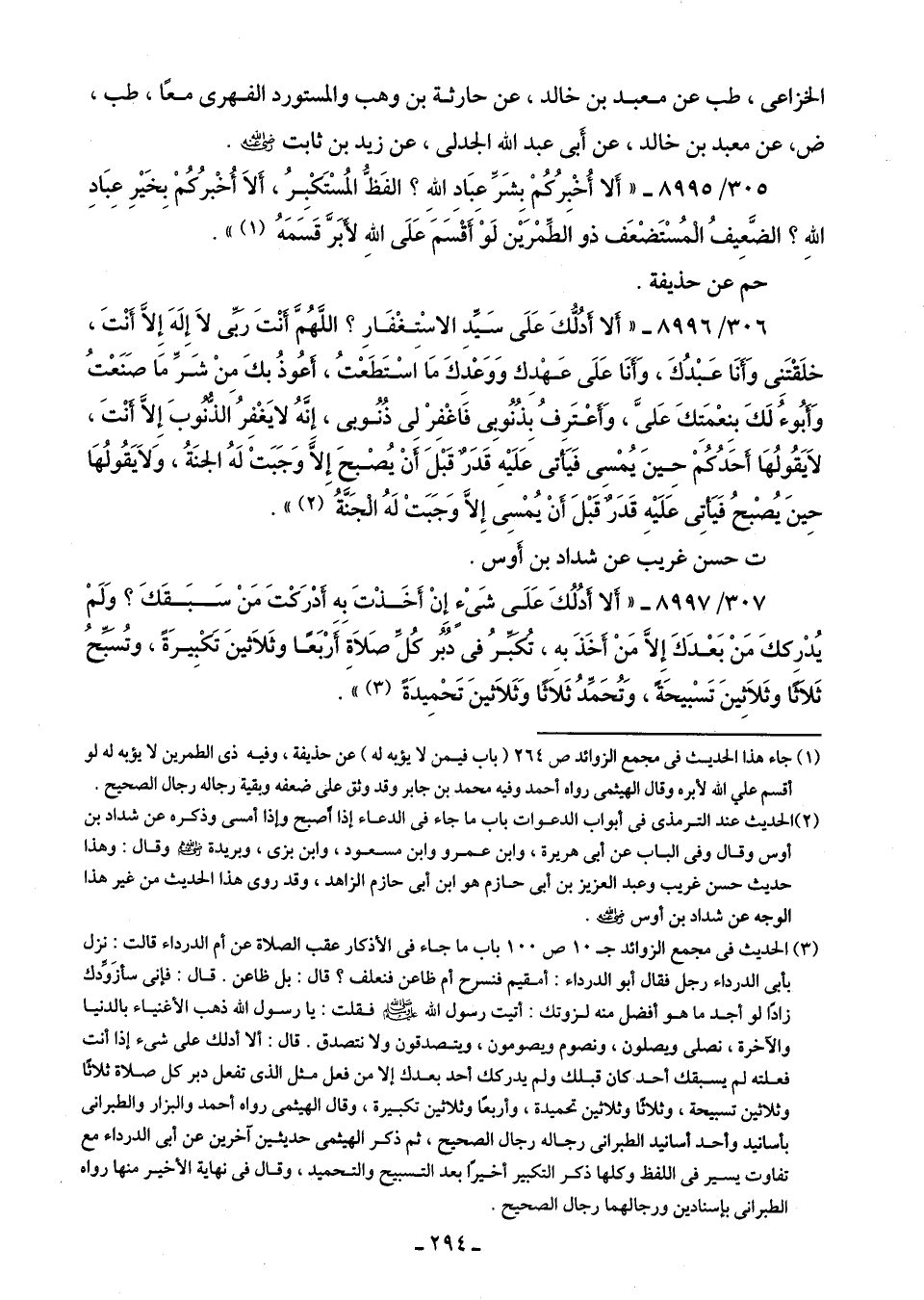 307/ 8997 - "أَلا أدُلُكَ عَلَى شَىْءٍ إِنْ أَخَذْتَ به أدْرَكْتَ مَنْ سَبَقَكَ؟ وَلَمْ يُدْرككَ مَنْ بَعْدَكَ إِلَّا مَنْ أَخَذَ بهِ، تُكبِّرُ في دُبُر كُلِّ صَلَاة أَرْبَعًا وثَلَاثينَ تَكْبِيرَةً، وتُسبِّحُ ثَلَاثًا وثَلَاثينَ تَسْبيحَةً، وَتُحَمِّدُ ثَلاثًا وَثَلَاثينَ تَحْمِيدَةً (¬3) ".