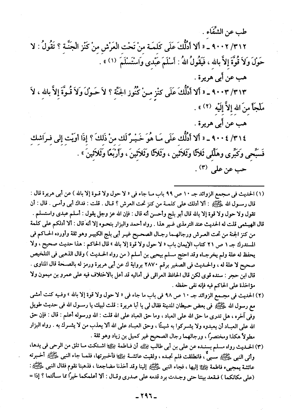 312/ 9002 - "أَلا أدُلُّكَ عَلَى كَلِمَة مِنْ تَحْتِ الْعَرْشِ مِنْ كَنْز الْجَنَّةِ؟ تَقُولُ: لا حَوْلَ وَلَا قُوَّةَ إِلَّا باللَّهِ، فَيَقُولُ اللَّهُ: أَسْلَمَ عَبْدِى وَاسْتَسْلَمَ (¬1) ".