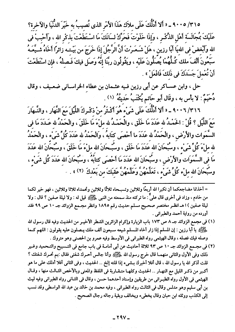 316/ 9006 - "أَلا أَدُلُّك عَلَى شَىْء هُوَ أَكْثَرُ مِنْ ذكْركَ اللَّيْلَ مَعَ النَّهَار، والنَّهَارَ مَعَ اللَّيْل؟ قُلْ: الحَمْدُ للَّه عَدَدَ مَا خَلَق، والحَمْدُ للَّهِ مِلْءَ مَا خَلَقَ، والحَمْدُ للَّه عَدَدَ مَا في السَّمَوات والأَرْضِ، والحمْدُ للَّهِ عَدَدَ ما أحْصَى كتَابهُ، وَالحَمدُ للَّهِ عَدَدَ كُلِّ شَىْء، والحَمْدُ للَّهِ مِلْءَ كُلِّ شَىْءٍ، وسُبْحَانَ اللَّه عَدَدَ مَا خَلَق، وسُبْحَانَ اللَّهِ مِلْءَ مَا خَلَقَ، وسُبْحَانَ اللَّهِ عَدَدَ مَا في السَّمَوَات وَالأَرْضِ، وسُبْحَانَ اللَّه عَدَدَ مَا أحْصَى كِتابُهُ، وسُبْحَانَ اللَّه عَدَدَ كُل شَىْءٍ، وسُبْحَانَ اللَّهِ مِلْء كُلِّ شَيءٍ، تَعَلمْهُنَّ وَعلمْهُنَّ عَقِبَكَ مِن بَعْدِكَ (¬2) ".