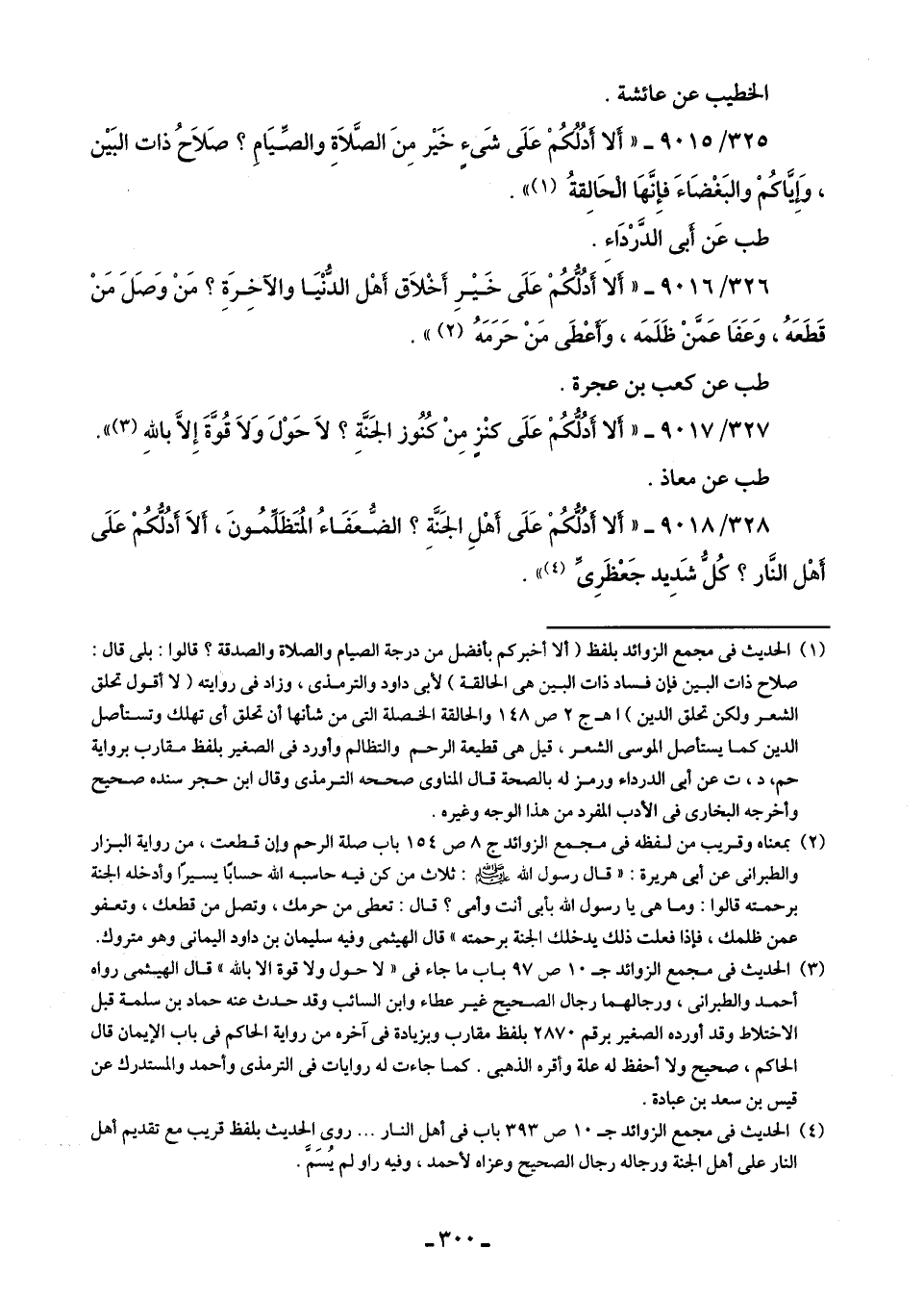 325/ 9015 - "أَلا أَدُلُّكُمْ عَلَى شَئٍ خَيْر مِنَ الصَّلَاة والصِّيَامِ؟ صَلَاحُ ذات البَيْن، وَإِيَّاكُمْ والبَغْضَاءَ فإِنَّهَا الحَالِقةُ (¬1) ".