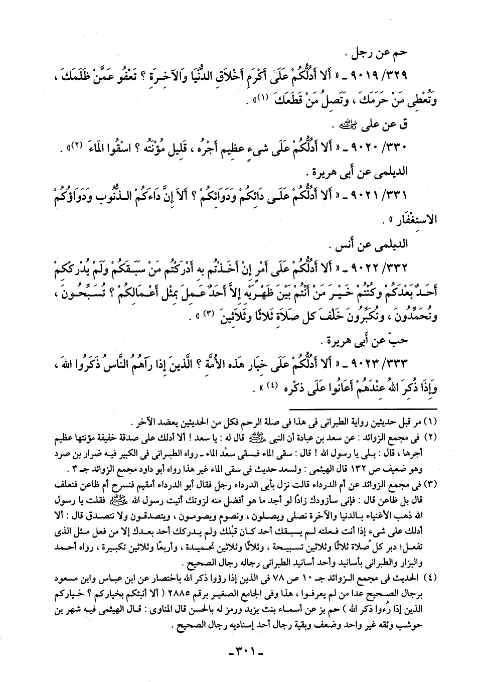 332/ 9022 - "أَلا أَدُلُّكُمْ عَلَى أَمْر إِنْ أَخَذتُم به أَدْرَكْتُم مَنْ سَبَقَكُمْ وَلَم يُدْركْكِمْ أحَدٌ بَعدَكُمْ وكُنْتُمْ خَيْرَ مَنْ أَنْتُمْ بَيْنَ ظَهْرَيْه إِلَّا أَحَدٌ عَمِلَ بمثْل أعْمَالكُمْ؟ تُسبِّحُونَ، وتُحَمِّدُونَ، وتُكَبِّرُونَ خَلفَ كل صَلَاةِ ثَلاثًا وثَلَاثِينَ (¬3) ".