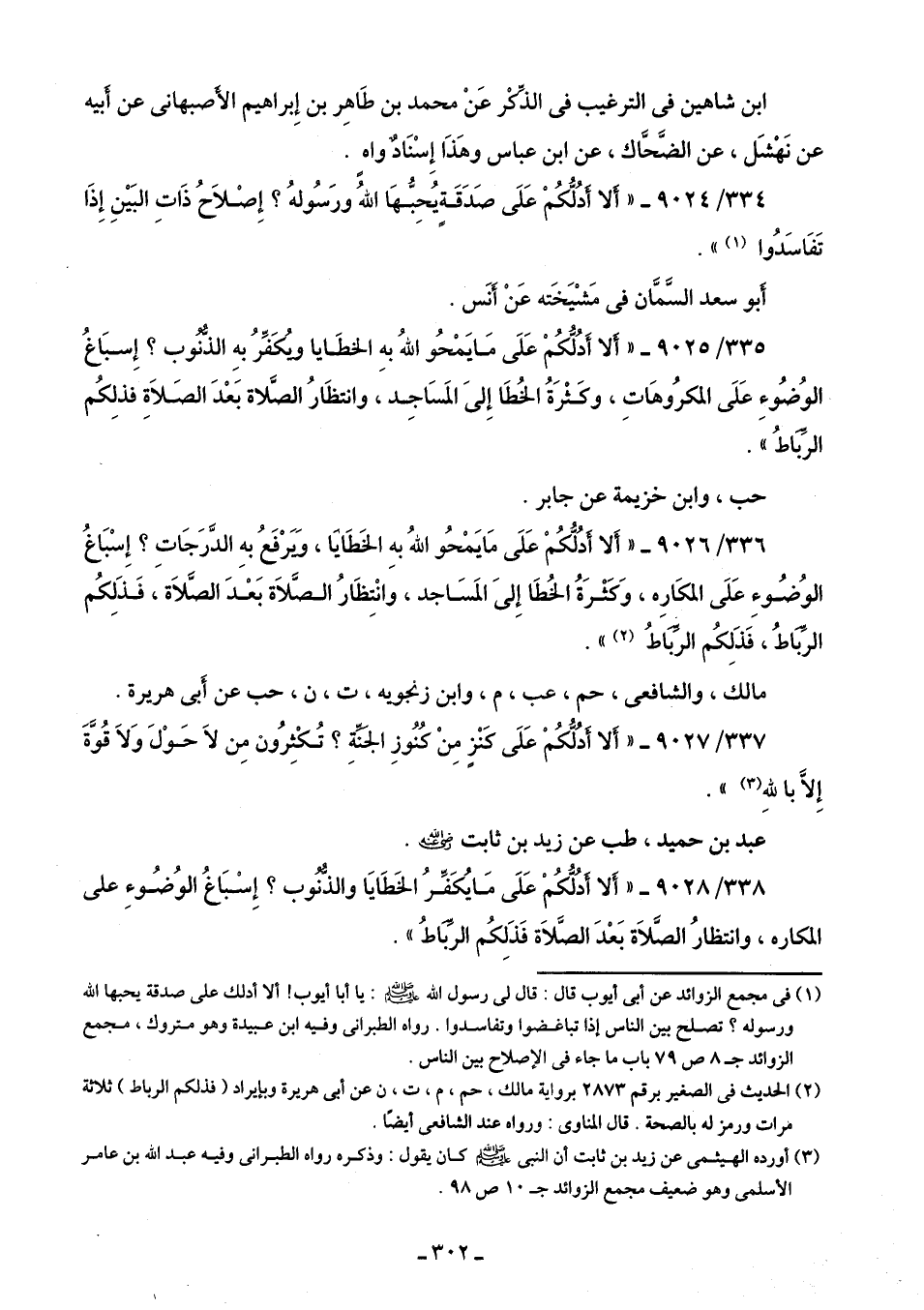 338/ 9028 - "أَلا أدُلُّكُمْ عَلَى مَا يُكَفِّرُ الخَطَايَا والذُّنُوب؟ إِسْبَاغُ الوُضُوءِ على المكاره، وانتظارُ الصَّلَاة بَعْدَ الصَّلَاة فَذَلِكُم الرِّبَاطُ".