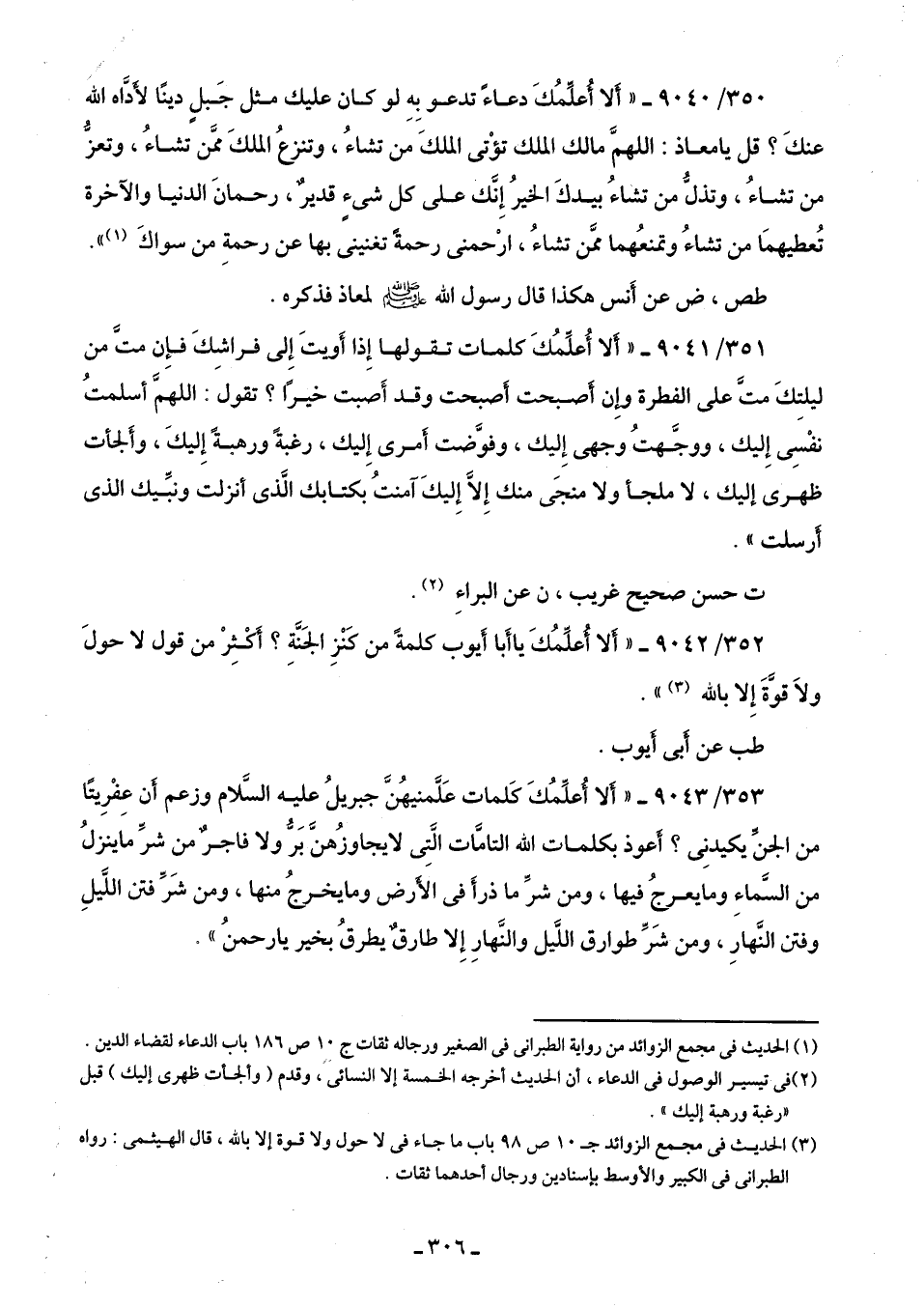 350/ 9040 - "أَلا أُعلِّمُكَ دعاءً تدعو بِهِ لو كان عليك مثل جَبلٍ دينًا لأَدَّاه اللَّه عنكَ؟ قل يا معاذ: اللهمَّ مالك الملك تؤْتى الملكَ من تشاءُ، وتنزعُ الملكَ ممَّن تشاءُ، وتعزُّ من تشاءُ، وتذلُّ من تشاءُ بيدكَ الخيرُ إِنَّك على كل شئٍ قديرٌ، رحمانَ الدنيا والآخرة تُعطيهمَا من تشاءُ وتمنعُهما ممَّن تشاءُ، ارْحمنى رحمة تغنينى بها عن رحمةِ من سواكَ (¬1) ".