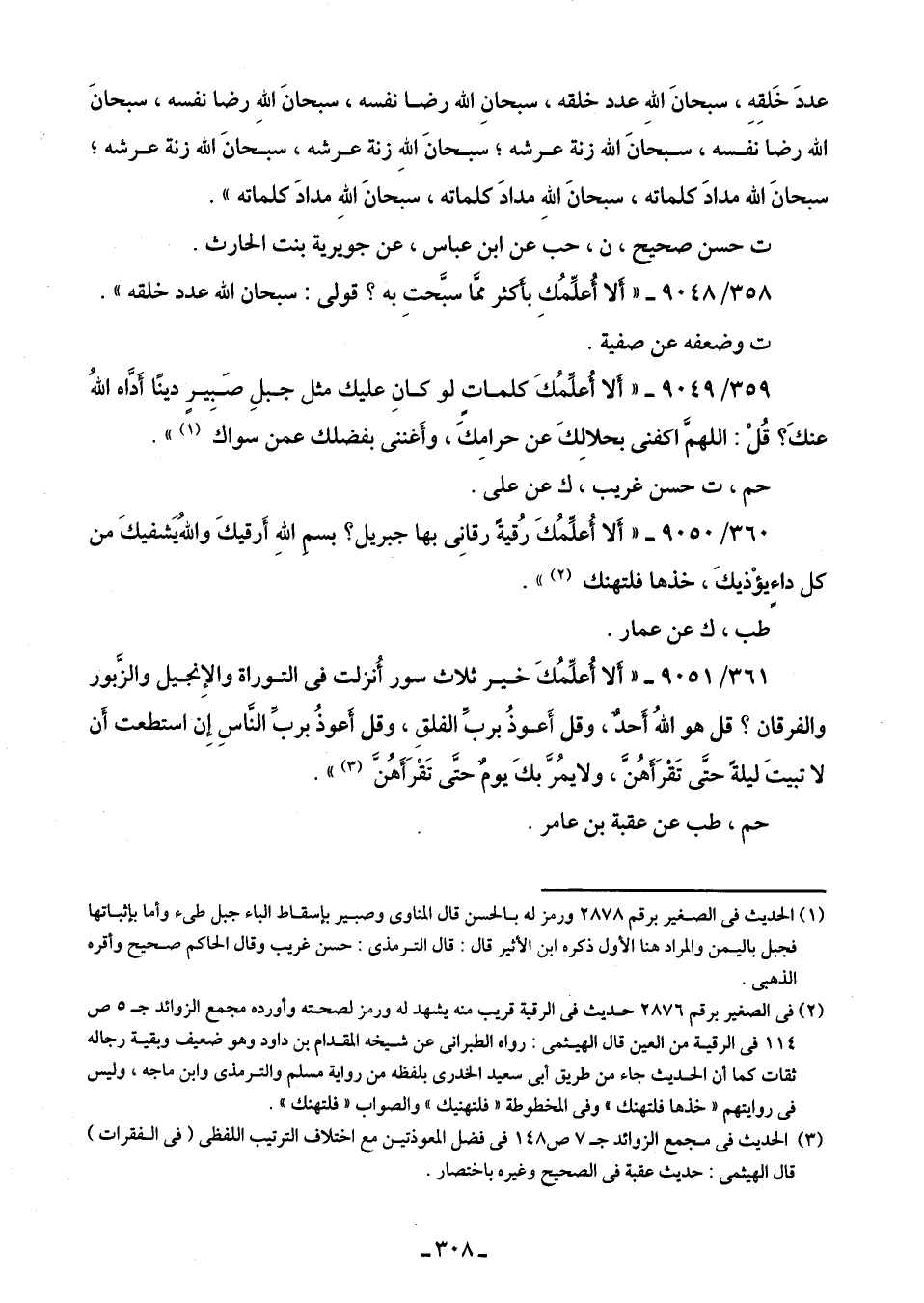 361/ 9051 - "أَلا أُعلِّمُكَ خير ثلاث سور أُنزلت في التوراة والإِنجيل والزَّبور والفرقان؟ قل هو اللَّهُ أَحدٌ، وقيل أَعوذُ بربِّ الفلقِ، وقيل أعوذُ بربِّ النَّاسِ إِنَّ استطعت أن لا تبيتَ ليلةً حتَّى تَقْرَأهُنَ، ولا يمُرَّ بكَ يومٌ حتَّى تَقْرَأَهُن (¬3) ".