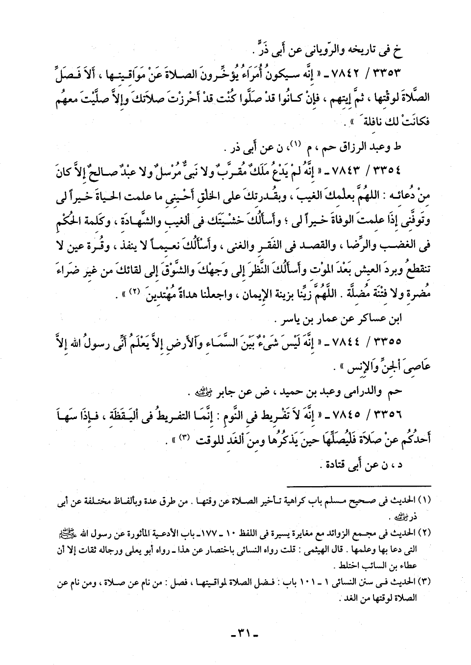 3353/ 7842 - "إِنَّه سيكونُ أُمَرَاءُ يُؤخِّرونَ الصَّلاةَ عَنْ مَوَاقِيتِها، أَلَا فَصَلِّ الصَّلاةَ لوقْتِها، ثمَّ إِيتِهم، فإِنْ كانُوا قدْ صَلَّوا كُنْت قدْ أحْرزْتَ صلَاتكَ وإِلَّا صلَّيْتَ معهُم فكانَتْ لك نافلةَ".