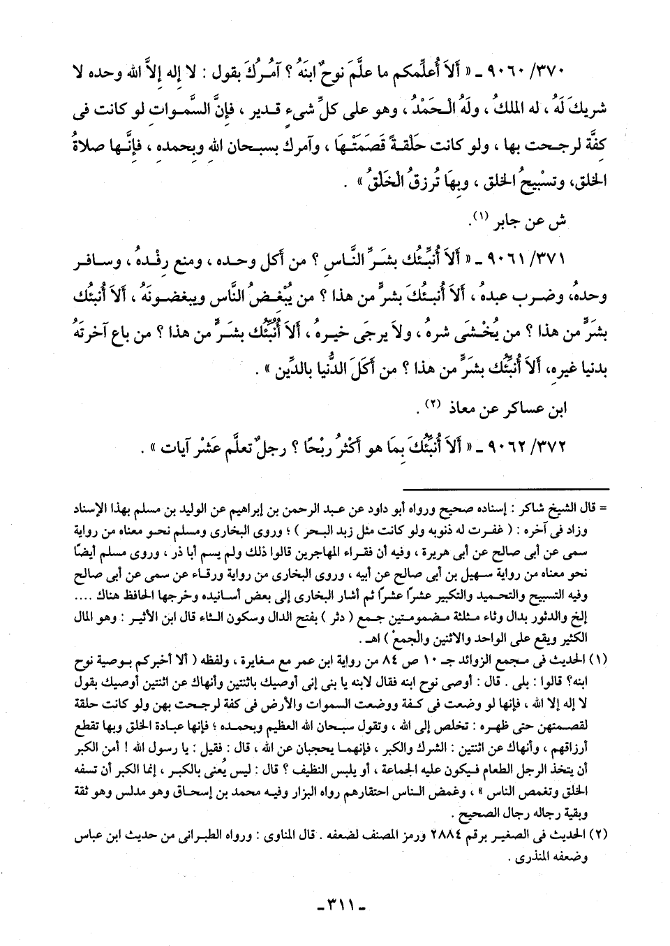 370/ 9060 - "أَلَا أُعلِّمكم ما علَّمَ نوحٌ ابنَهُ؟ آمُرُكَ يقول: لا إِله إِلَّا اللَّه وحده لا شريكَ لَهُ، له الملكُ، ولَهُ الحَمْدُ، وهو على كلِّ شئٍ قدير، فإِنَّ السَّمواتِ لو كانت في كِفَّة درجحت بها، ولو كانت حَلقةً قَصَمَتْهَا، وآمرك بسبحان اللَّه وبِحمده، فإِنَّها صلاةُ الخلق، وتسْبيحُ الخلق، وبِهَا تُرزقُ الخلقُ".