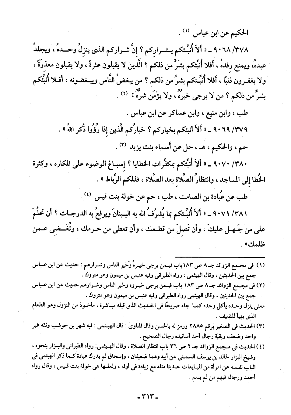 378/ 9068 - "ألَا أُنبِّئكم بشرارِكم؟ إِنَّ شراركم الذى ينزِلُ وحدهُ، ويجلدُ عبدهُ، ويمنع رِفدهُ، أفلا أُنبِّئكم بشَرٍّ من ذلكم؟ الَّذين لا يقيلون عثرةً، ولا يقبلون معذرَةً، ولا يغفرون ذنبًا، أفلا أُنبِّئكم بشرٍّ من ذلكم؟ من يبغضُ النَّاس ويبغضونه، أفلا أُنبِّئكم بشرٍّ من ذلكم؟ من لا يرجى خيرُهُ، ولا يؤْمَن شرُّهُ" (¬2).