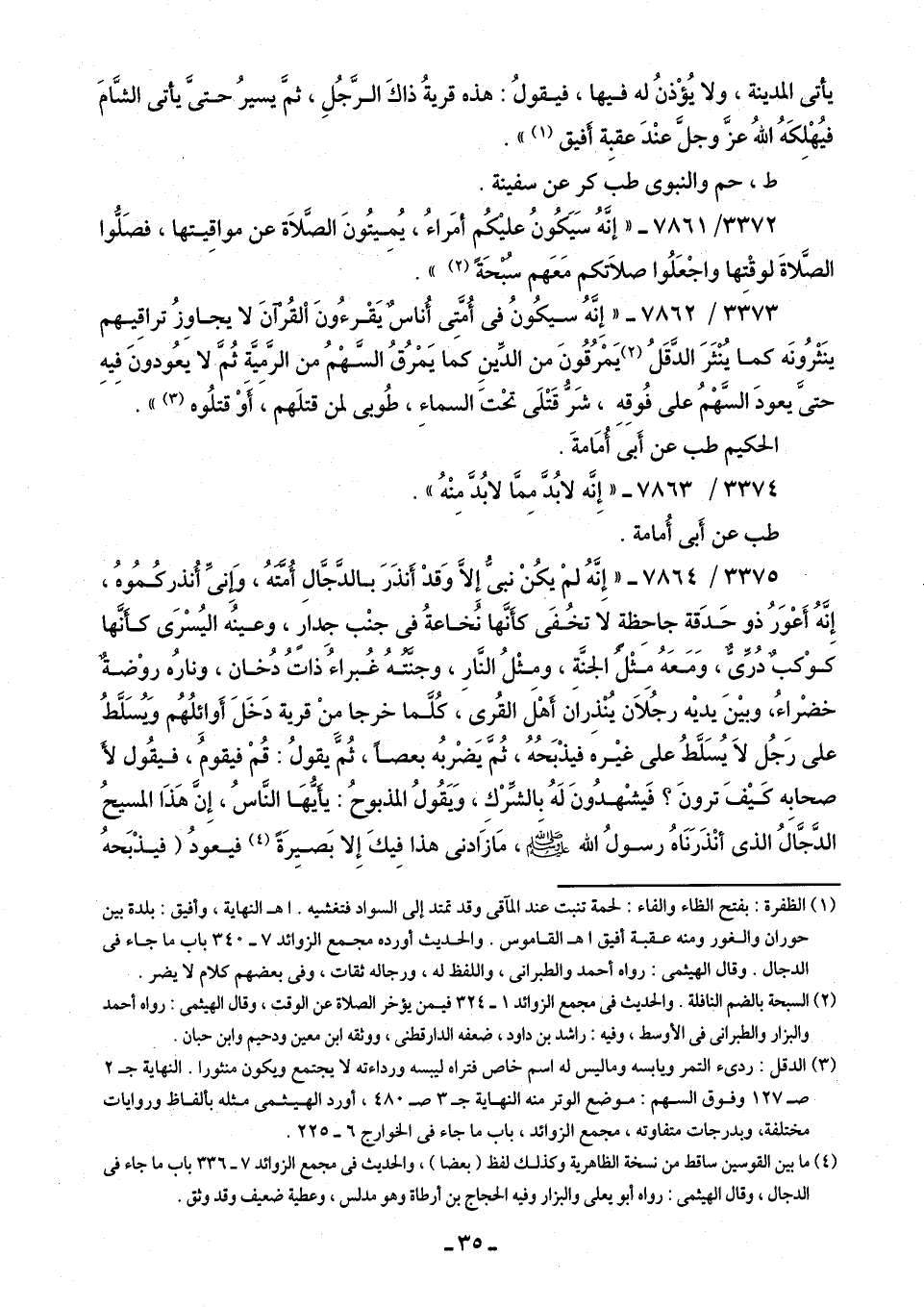 3375/ 7864 - "إِنَّهُ لمْ يكُنْ نبىٌّ إِلَّا وَقدْ أَنذَرَ بالدَّجَّالِ أُمَّتهُ، وَإِنِّى أُنذركُمُوهُ، إِنَّهُ أَعْوَرُ ذو حَدَقة جاحِظة لا تخُفَى كأَنَّها نُخاعةُ في جنْب جدارٍ، وعينُه اليُسْرَى كأَنَّها كوْكبٌ دُرِّىٌّ، وَمَعَهُ مَثْل الجنَّة، ومثْلُ النَّارِ، وجنَّتُهُ غُبراءُ ذاتُ دُخان، ونارُه روْضةٌ خضْراءُ، وبيْنَ يديْه رجُلَان يُنْذِران أَهْل القُرى، كُلَّما خرجا منْ قرية دَخَلَ أَوائِلُهُم وَيُسَلَّطُ على رَجُل لَا يُسَلَّطُ على غيْره فيذْبَحُهُ، ثُمَّ يَضْربُه بعصًا، ثُمَّ يقولُ: قُمْ فيقومُ، فيقُول لأصحابه كَيْفَ ترونَ؟ فَيشْهدُونَ لَهُ بالشِّرْكِ، وَيَقُولُ المذبوحُ: يأَيُّهَا النَّاسُ، إِنَّ هَذَا المسيحُ الدَّجَّالُ الذى أنْذَرَنَاهُ رسولُ اللَّه -صلى اللَّه عليه وسلم-، مَا زَادنى هذا فِيكَ إِلا بَصيِرَةً (¬4) فيعودُ (فيذْبَحهُ