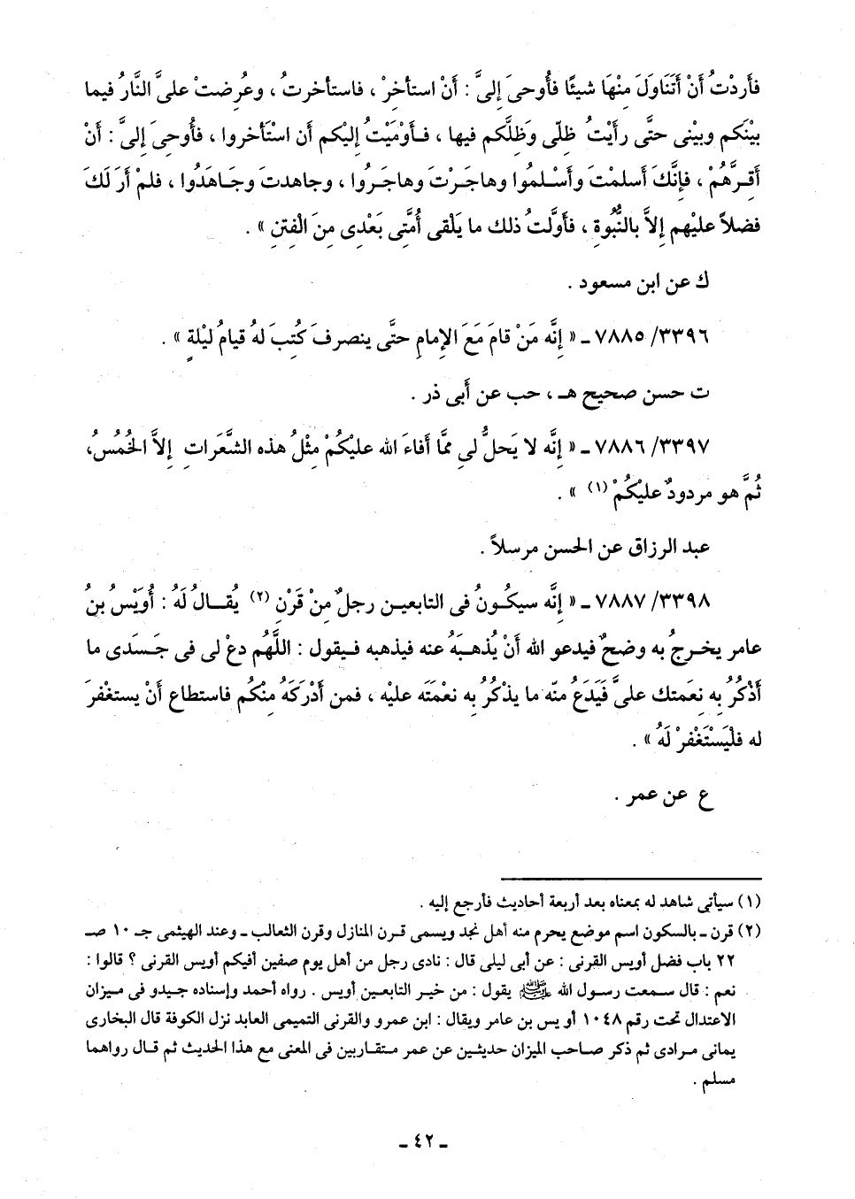 3398/ 7887 - "إِنَّه سيكُونُ في التابعين رجلٌ مِنْ قَرْنِ (¬2) يُقالُ لَهُ: أُوَيْسُ بنُ عامر يخرجُ به وضحٌ فيدعو اللَّه أَنْ يُذهبَهُ عنه فيذهبه فيقول: اللَّهُم دعْ لى في جَسَدى ما أذكُرُ به نعَمتك علىَّ فَيَدعُ منّهْ ما يذْكُرُ بِه نعْمَتَه عليْه، فمن أدْرَكَهُ مِنْكُم فاستطاع أَنْ يستغْفرَ له فليَستَغفرْ لَهُ".