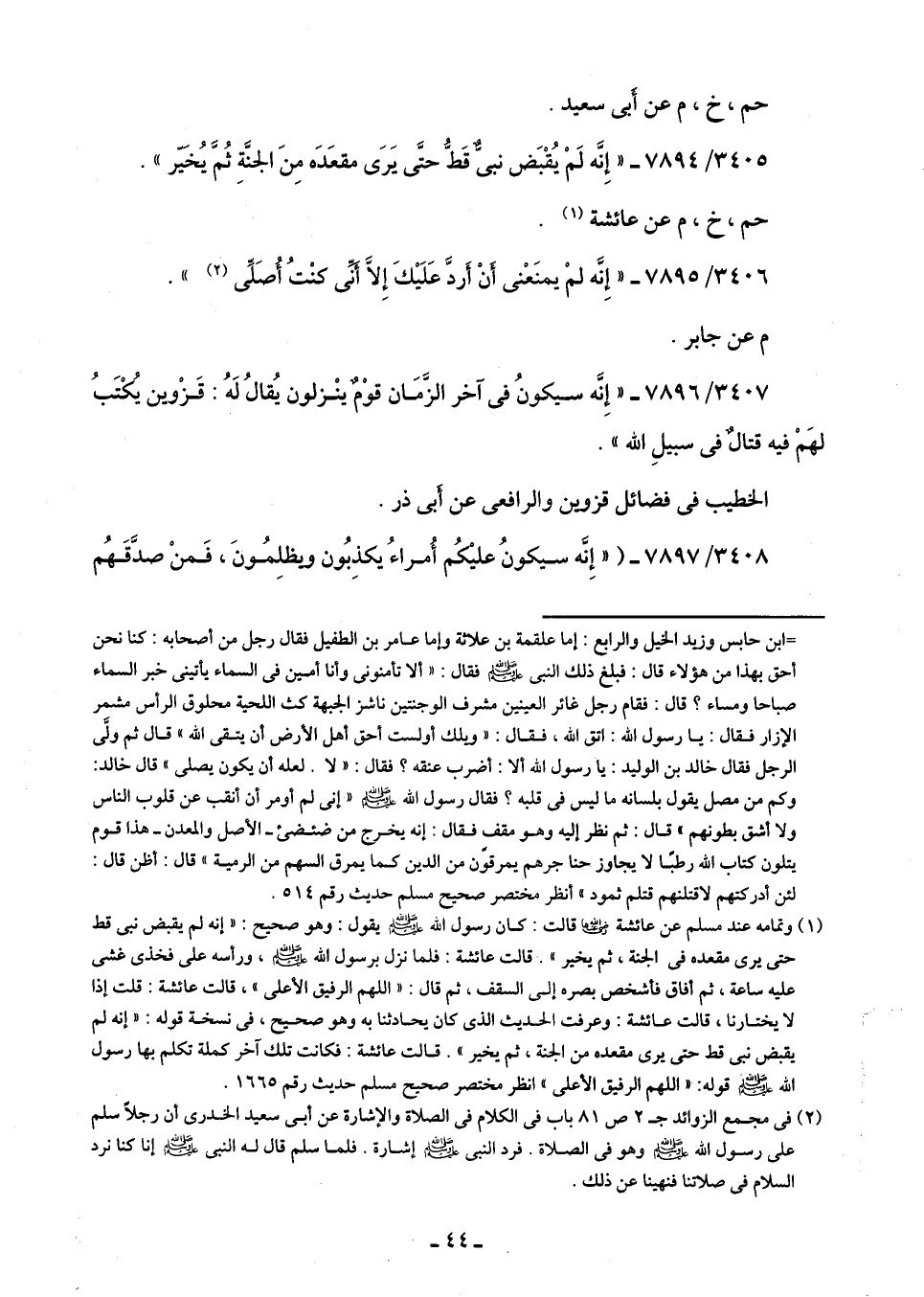3405/ 7894 - "إِنَّه لَمْ يُقْبَض نبىٌّ قَطُّ حتَّى يَرَى مقعَدَه مِنَ الجنَّةِ ثُمَّ يُخير".