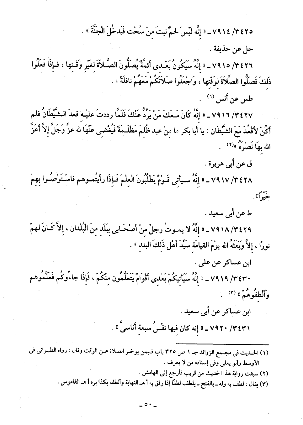 3429/ 7918 - "إِنَّهُ لا يموتُ رجلٌ مِنْ أصْحَابى بِبَلَدِ مِنَ الْبُلدان، إِلَّا كَانَ لهمْ نورًا، إِلَّا وَبَعَثَهُ اللَّه يوْمَ القيامَةِ سيِّدَ أَهْل ذَلِكَ البلدِ".