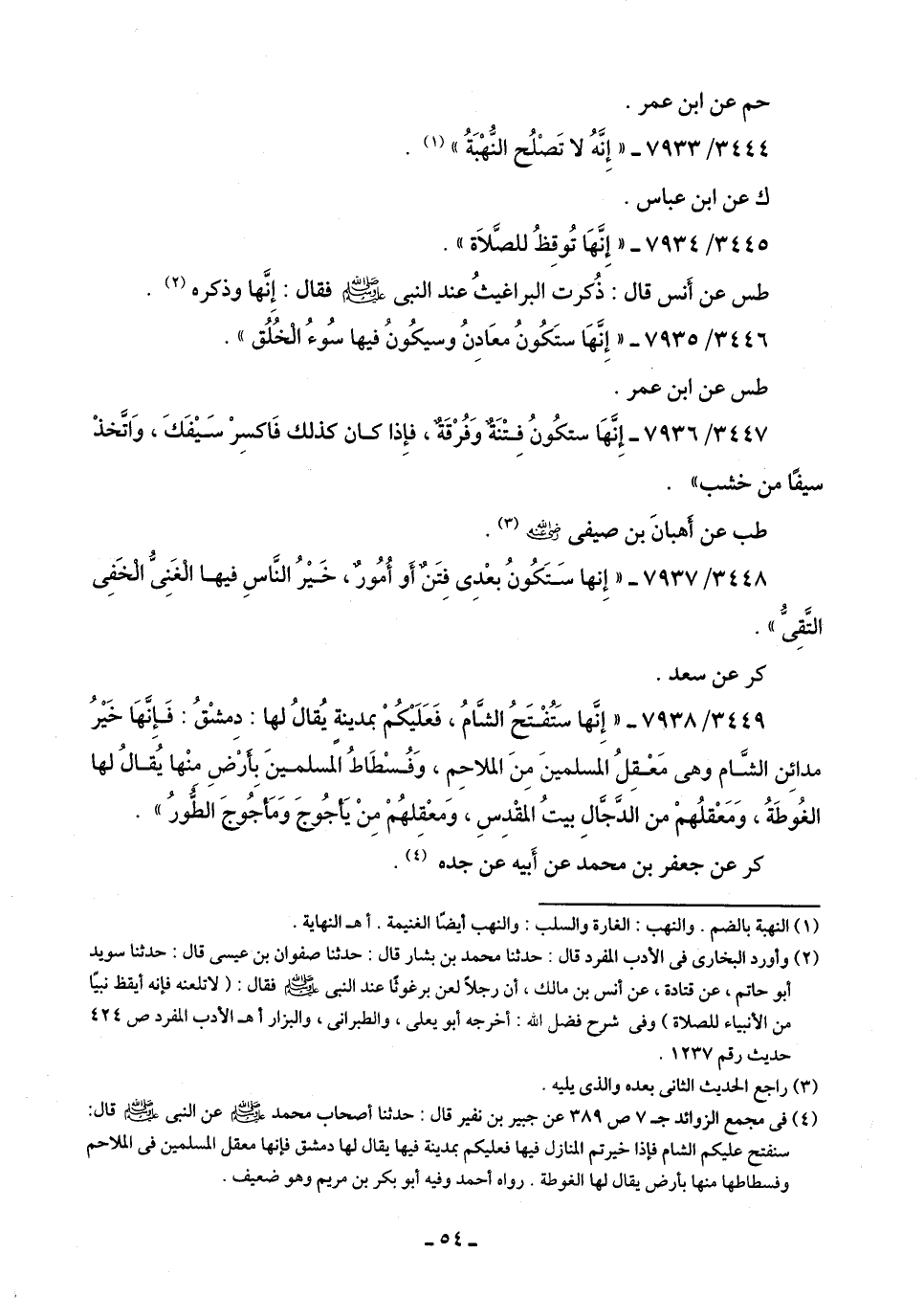 (¬4) في مجمع الزوائد جـ 7 ص 389 عن جبير بن نفير قال: حدثنا أصحاب محمد -صلى اللَّه عليه وسلم- عن النبى -صلى اللَّه عليه وسلم- قال: سنفتح عليكم الشام فإذا خبرتم المنازل فيها فعليكم بمدينة فيها يقال لها دمشق فإنها معقل المسلمين في الملاحم وفسطاطها منها بأرض يقال لها الغوطة. رواه أحمد وفيه أبو بكر بن مريم وهو ضعيف.