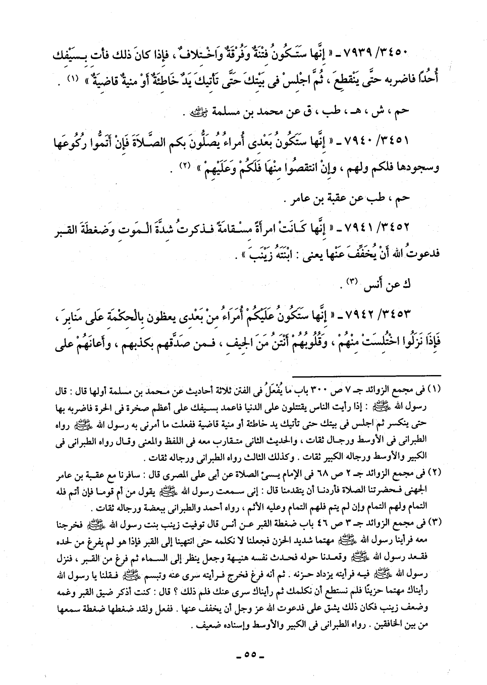 (¬1) في مجمع الزوائد جـ 7 ص 300 باب ما يُفْعَلُ في الفتن ثلاثة أحاديث عن محمَّد بن مسلمة أولها قال: قال رسول اللَّه -صلى اللَّه عليه وسلم-: إذا رأيت الناس يقتتلون على الدنيا فاعمد بسيفك على أعظم صخرة في الحرة فاضربه بها حتى ينكسر ثمَّ اجلس في بيتك حتى تأتيك يد خاطئة أو منية قاضية ففعلت ما أمرنى به رسول اللَّه -صلى اللَّه عليه وسلم- رواه الطبرانى في الأوسط ورجال ثقات، والحديث الثاني متقارب معه في اللفظ والمعنى وقال رواه الطبرانى في الكبير والأوسط ورجاله الكبير ثقات. وكذلك الثالث رواه الطبرانى ورجاله ثقات.