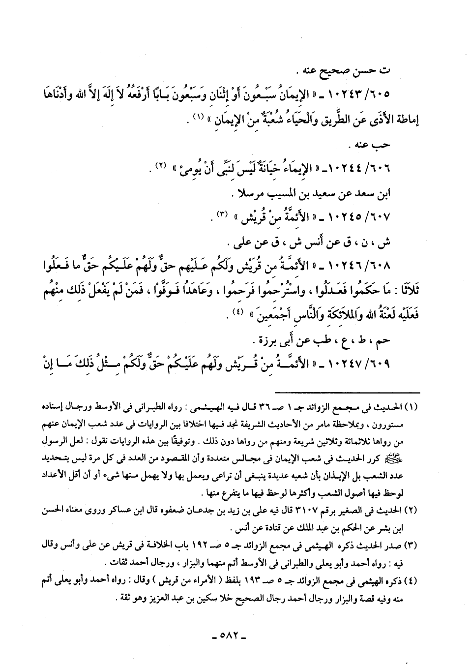 608/ 10246 - "الأئِمَّةُ مِن قُرَيش وَلَكُم عَلَيهم حقٌّ وَلَهُمْ عَلَيكُم حَقٌّ ما فَعَلُوا ثَلاثًا: مَا حَكَمُوا فَعَدَلُوا، واسْتُرْحِمُوا فَرَحمُوا، وَعَاهَدُا فَوَفَّوْا، فَمَنْ لَمْ يَفْعَلْ ذَلِك مِنْهُم فَعَلَيه لَعْنَةُ الله وَالملائكَةِ وَالْنَّاسِ أَجْمَعِينَ" (¬4).