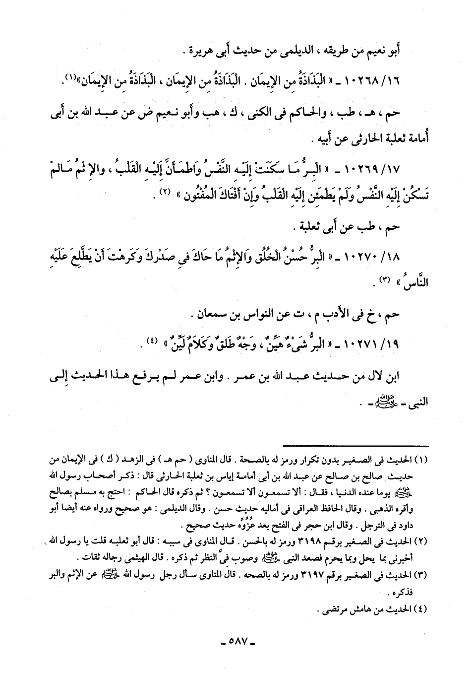 18/ 10270 - "الْبِرُّ حُسْنُ الْخُلُق وَالإِثْمُ مَا حَاكَ في صَدْركَ وَكَرهْتَ أنْ يَطَّلِعَ عَلَيهِ النَّاسُ" (¬3).