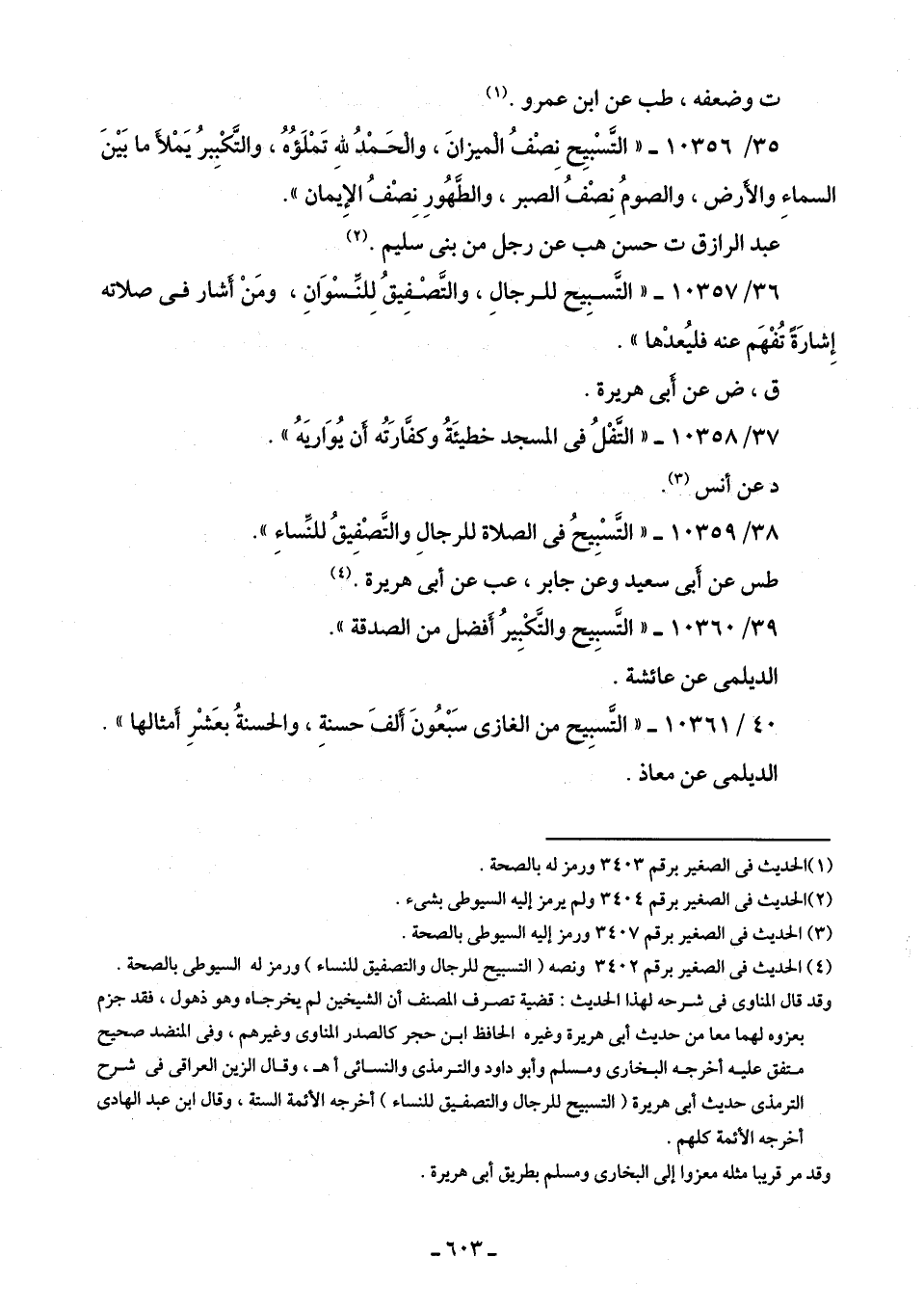 وقد قال المناوى في شرحه لهذا الحديث: قضية تصرف المصنف أن الشيخين لم يخرجاه وهو ذهول، فقد جزم بعزوه لهما معا من حديث أَبى هريرة وغيره الحافظ ابن حجر كالصدر المناوى وغيرهم، وفي المنضد صحيح متفق عليه أخرجه البخاري ومسلم وأبو داود والترمذي والنسائي أهـ، وقال الزين العراقي في شرح الترمذي حديث أَبى هريرة (التسبيح للرجال والتصفيق للنساء) أخرجه الأئمة الستة، وقال ابن عبد الهادي أخرجه الأئمة كلهم.