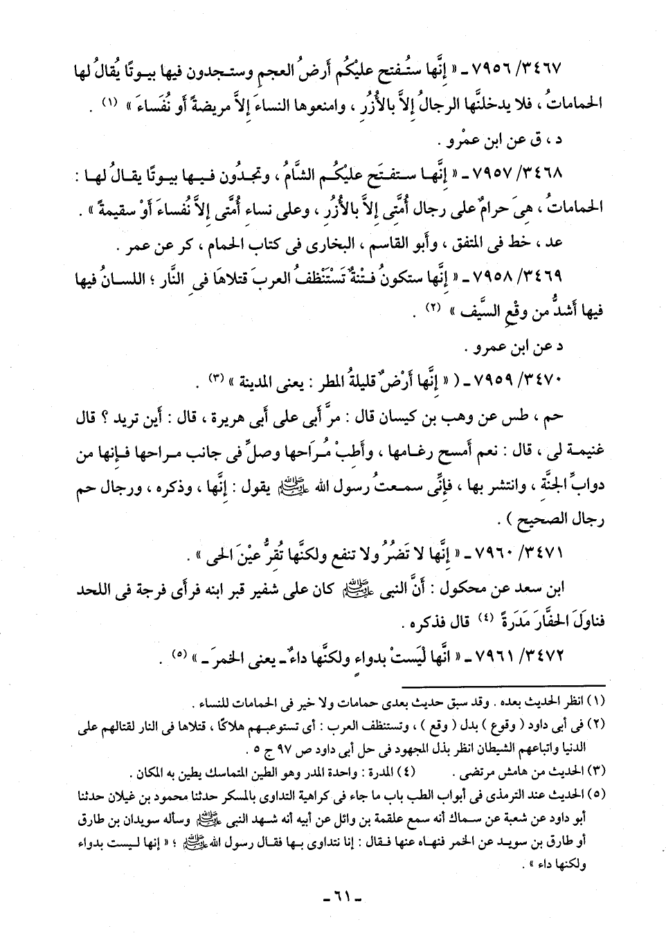 3468/ 7957 - "إِنَّها ستفتَح عليْكُم الشَّامُ، وتجدُون فيها بيوتًا يقالُ لها: الحماماتُ، هِى حرامٌ على رجال أُمَّتِى إِلَّا بالأُزُرِ، وعلى نساءِ أُمَّتى إِلَّا نُفساءَ أَوْ سقيمةً".