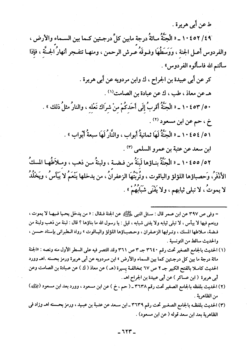 (¬1) الحديث بالجامع الصغير تحت رقم 3640 جـ 3 ص 361 وقد اقتصر فيه على السطر الأول منه ونصه: "الجنة مائة درجة ما بين كل درجتين كما بين السماء والأرض" ابن مردويه عن أَبي هريرة ورمز بحسنه. اهـ وورد الحديث كاملًا بالفتح الكبير جـ 2 ص 67 بمخالفة يسيرة (هـ) عن معاذ (ك) عن عبادة بن الصامت وعن أَبى هريرة (ابن عساكر) عن أبي عبيدة بن الجراح اهـ.