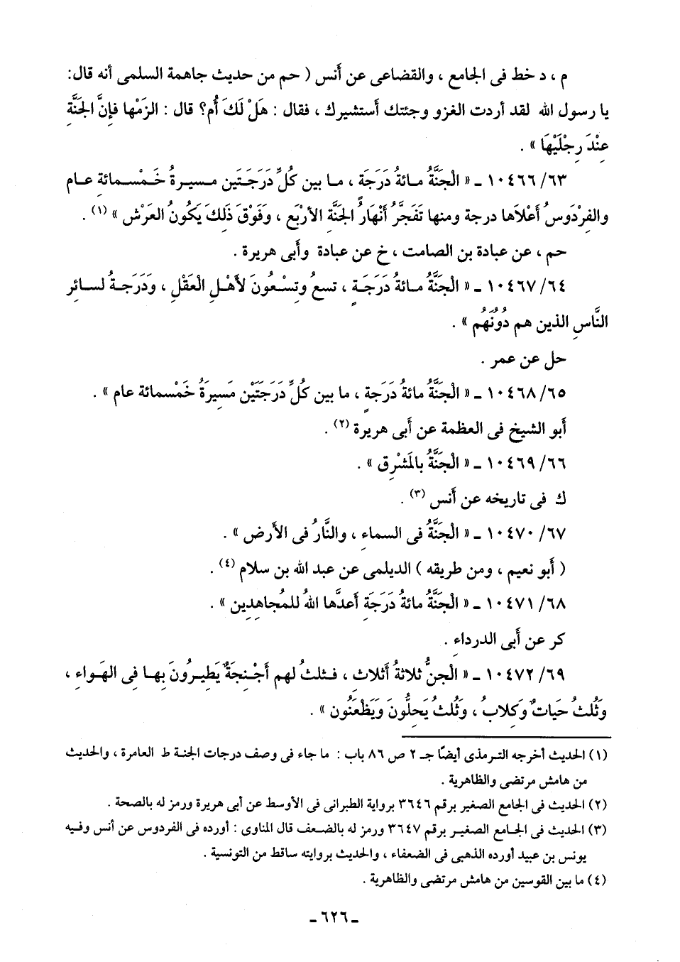 63/ 10466 - "الْجَنَّةُ مائةُ دَرَجَة، ما بين كُل دَرَجَتَين مسيرةُ خَمْسمائة عام والفِرْدَوسُ أَعْلاها درجة ومنها تَفَجَرُ أنْهَارُ الجَنَّةِ الأرْبَع، وَفوْقَ ذَلِكَ يَكُونُ العَرْش" (¬1).