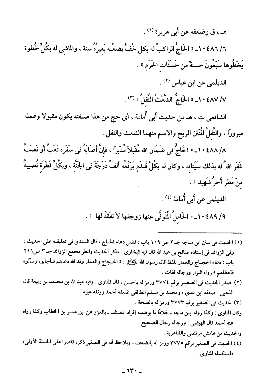 6/ 10486 - "الحَاجُّ الراكبُ له بكل خُفٍّ يضعُه بَعِيرُهُ سنة، والماشِى له بكُلِّ خُطوة يَخْطُوها سَبْعُونَ حسنةً من حَسَنَاتِ الحَرَم".