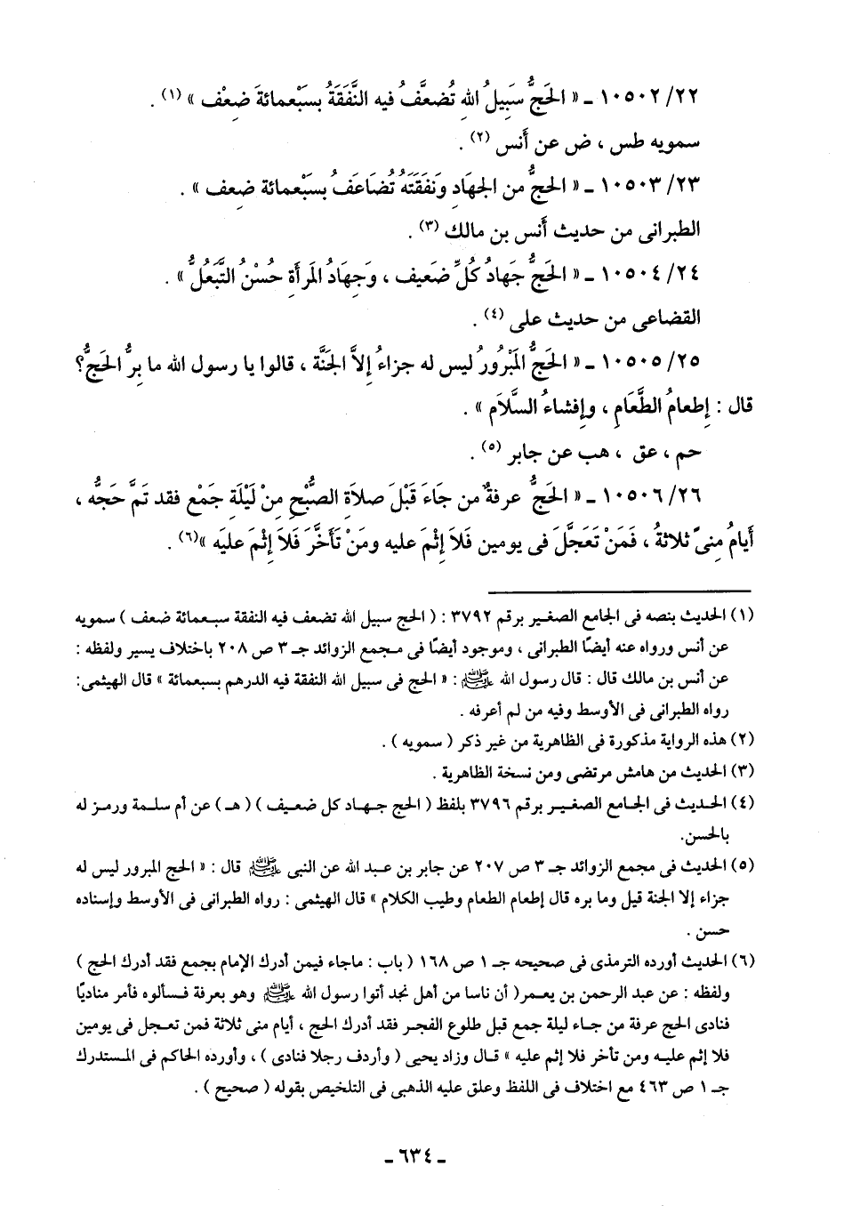 26/ 10506 - "الحَجُّ عرفةٌ من جَاءَ قَبْلَ صلاةِ الصُّبْح مِنْ لَيلَةِ جَمع فقد تَمَّ حَجُّه، أيامُ مِنى ثلاثةُ، فَمَنْ تَعَجَّلَ في يومين فَلَا إِثْمَ عليه ومَنْ تَأَخَّرَ فَلَا إِثْمَ عليه" (¬6).