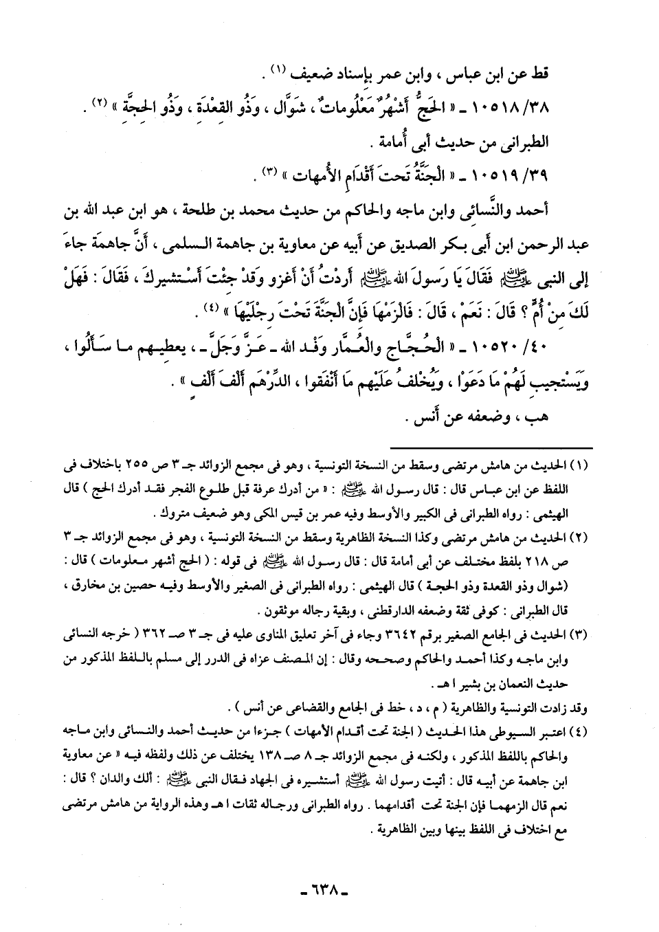 (¬4) اعتبر السيوطي هذا الحديث (الجنة تحت أقدام الأمهات) جزءًا من حديث أحمد والنسائي وابن ماجه والحاكم باللفظ المذكور، ولكنه في مجمع الزوائد ج 8 ص 138 يختلف عن ذلك ولفظه فيه "عن معاوية بن جاهمة عن أبيه قال: أتيت رسول الله - صلى الله عليه وسلم - أستشيره في الجهاد فقال النبي - صلى الله عليه وسلم -: ألك والدان؟ قال: نعم قال الزمهما فإن الجنة تحت أقدامهما. رواه الطبراني ورجاله ثقات اهـ وهذه الرواية من هامش مرتضى مع اختلاف في اللفظ بينها وبين الظاهرية.