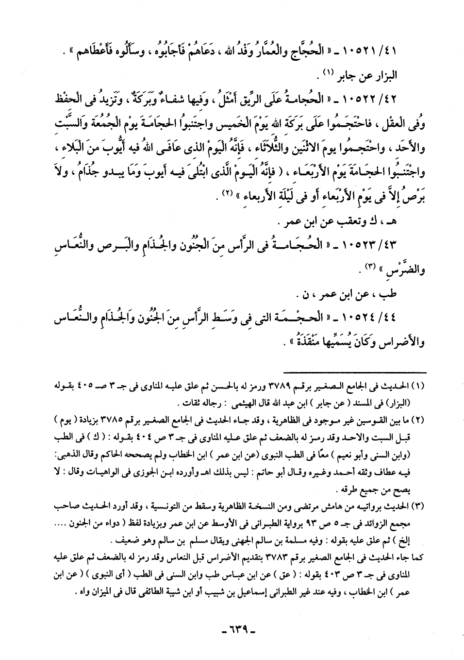 43/ 10523 - "الْحُجَامةُ في الرَّأس مِنَ الْجُنُون والجُذَام والْبَرص والنُّعَاسِ والضَّرْسِ" (¬3).