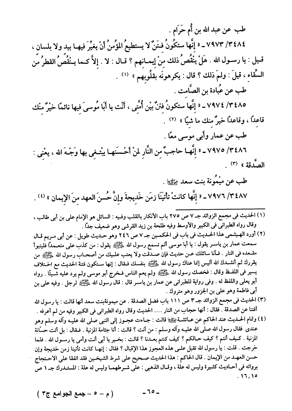 3485/ 7974 - "إِنَّها ستكونُ فِتنٌ بيْن أُمَّتِى، أَنْت يا أَبَا مُوسى فِيها نائمًا خيْرٌ مِنْك قاعِدًا، وقاعدًا خيرٌ مِنك ماشِيًا" (¬2).