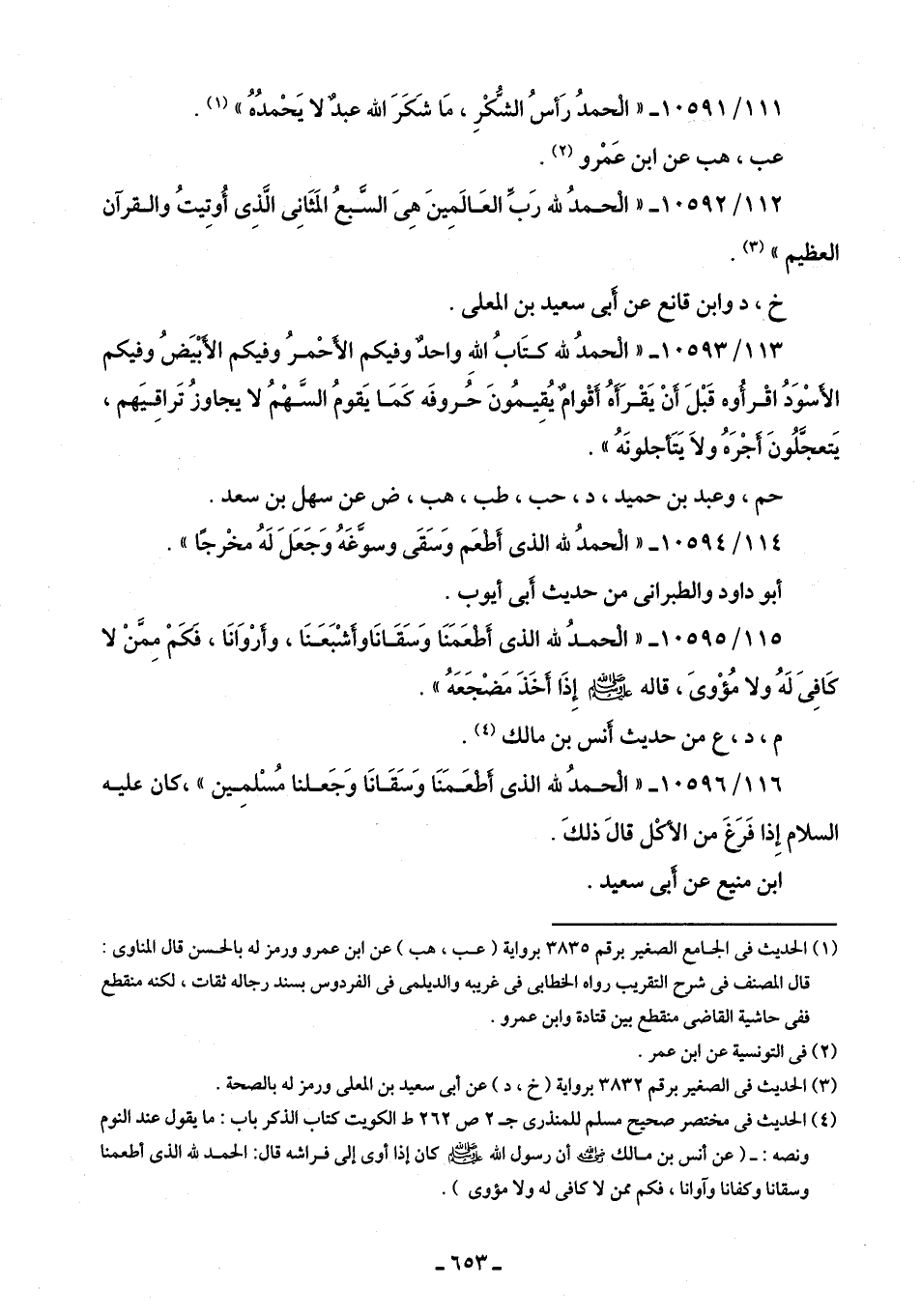 111/ 10591 - "الْحمدُ رَأسُ الشُّكْرِ، مَا شَكَرَ الله عبدٌ لا يَحْمدُهُ" (¬1).