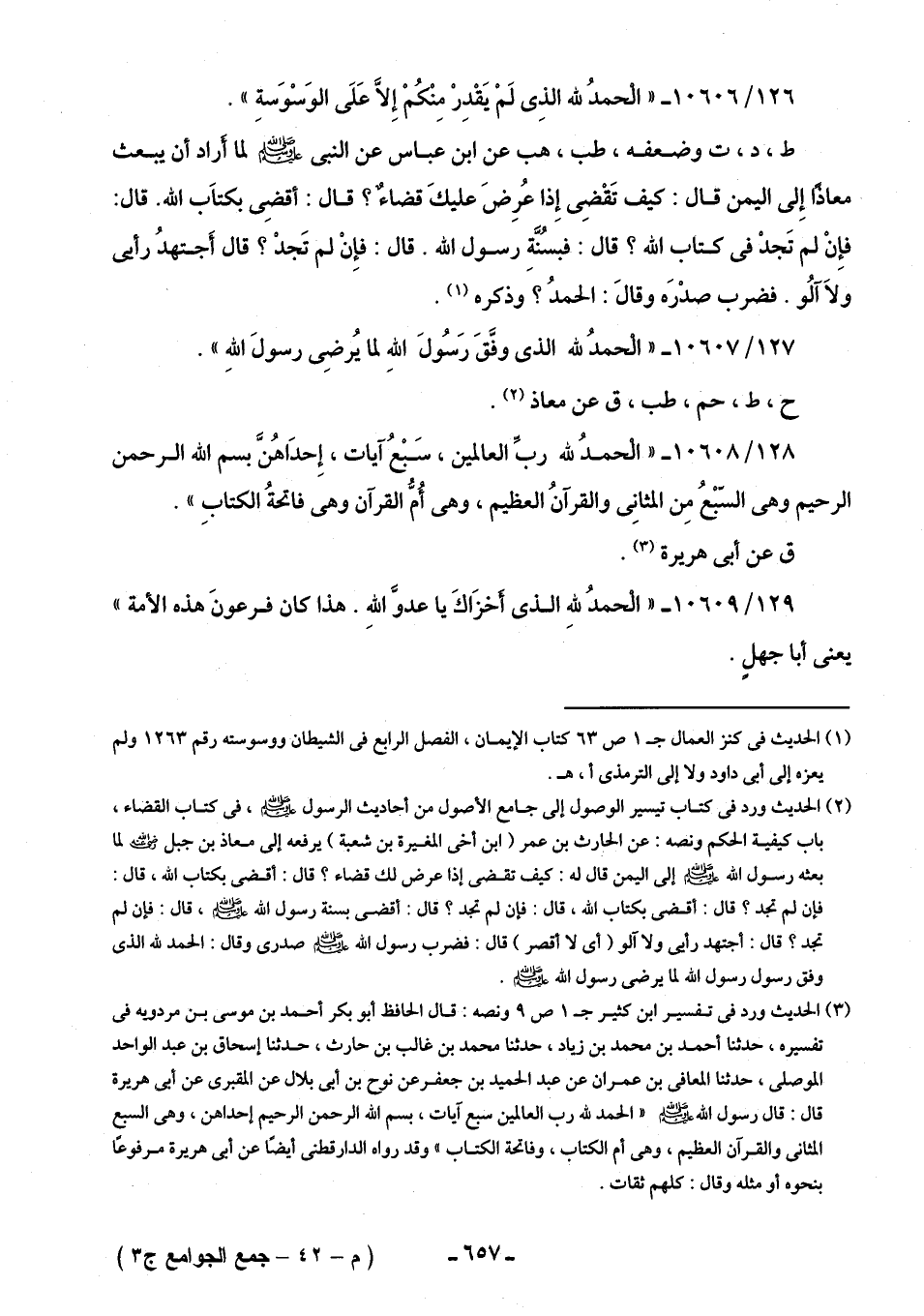 (¬2) الحديث ورد في كتاب تيسير الوصول إلى جامع الأصول من أحاديث الرسول - صلى الله عليه وسلم -، في كتاب القضاء، باب كيفية الحكم ونصه: عن الحارث بن عمر (ابن أخي المغيرة بن شعبة) يرفعه إلى معاذ بن جبل - رضي الله عنه - لما بعثه رسول الله - صلى الله عليه وسلم - إلى اليمن قال له: كيف تقضى إذا عرض لك قضاء؟ قال: أقضى بكتاب الله، قال: فإن لم تجد؟ قال: أقضى بكتاب الله، قال: فإن لم تجد؟ قال: أقضى بسنة رسول الله - صلى الله عليه وسلم -، قال: فإن لم تجد؟ قال: أجتهد رأيي ولا آلو (أي لا أقصر) قال: فضرب رسول الله - صلى الله عليه وسلم - صدرى وقال: الحمد لله الذي وفق رسول رسول الله لما يرضى رسول الله - صلى الله عليه وسلم -.