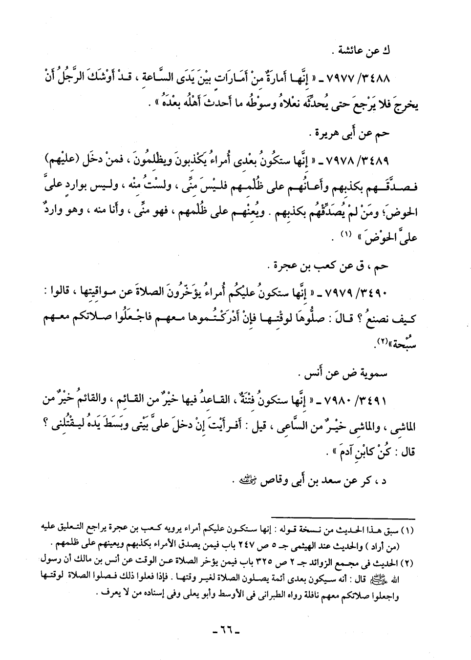 3490/ 7979 - "إِنَّها ستكونُ عليْكُم أُمراءُ يؤَخّرُونَ الصلاةَ عن مواقِيتِها، قالوا: كيف نصنعُ؟ قَالَ: صلُّوهَا لوقْتِها فإِنْ أَدْرَكْتُموها معهم فاجْعَلُوا صلاتكم معهم سُبْحة" (¬2).