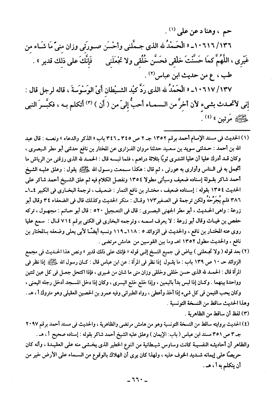 (¬1) الحديث في مسند الإمام أحمد برقم 1352 جـ 2 ص 345 - 346 باب "الذكر والدعاء" ونصه: قال عبد الله بن أحمد: حدثني سويد بن سعيد حدثنا مروان الفزارى عن المختار بن نافع حدثنى أبو مطر البصري، وكان قد أدرك عليا أن عليا اشترى ثوبًا بثلاثة دراهم، فلما لبسه قال: الحمد لله الذي رزقنى من الرياش ما أتجمل به في الناس وأوارى به عورتى، ثم قال: هكذا سمعت رسول الله - صلى الله عليه وسلم - يقول: وعلق عليه الشيخ أحمد شاكر بقوله: إسناده ضعيف وسيأتي مطولا 1354 ونفصل الكلام فيه ثم علق الشيخ أحمد شاكر على الحديث 1354 بقوله: إسناده ضعيف، مختار بن نافع التمار: ضعيف، ترجمة البخاري في الكبير 4 - 1 - 386 فلم يُجَرِّحْهُ ولكن ترجمة في الصغير 173 وقال: منكر الحديث وكذلك قال في الضعفاء 34 وقال أبو زرعة: واهى الحديث، أبو مطر الجهنى البصري: قال في التعجيل 520: قال أبو حاتم: مجهول، تركه حفص بن غياث وقال أبو زرعة: لا يعرف اسمه، وترجمه البخاري في الكنى برقم 714 قال: سمع عليا روى عنه المختار بن نافع، والحديث في الزوائد 5: 118 - 119 ونسبه أيضًا لأبي يعلى وضعفه بالمختار بن نافع، والحديث مطول 1352 اهـ وما بين القوسين من هامش مرتضى.
