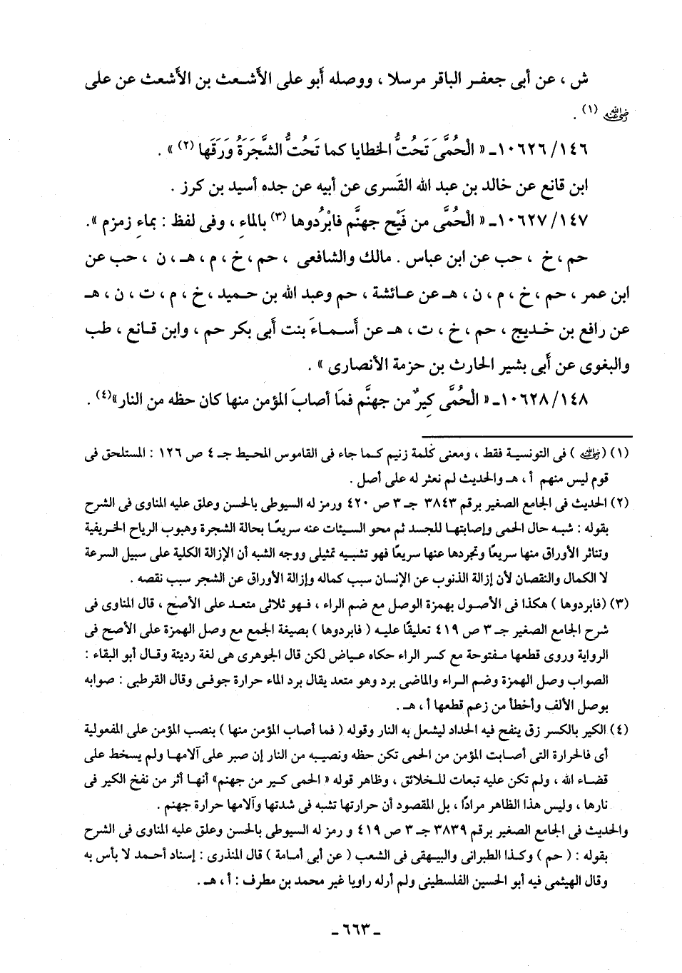 148/ 10628 - "الحُمَّى كِيرٌ من جهنَّم فمَا أصابَ المؤمن منها كان حظه من النار" (¬4).