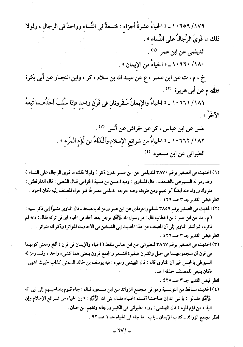 (¬3) الحديث في الصغير برقم 3867 للطبرانى عن ابن عباس بلفظ (الحياء والإيمان في قرن) ألخ ومعنى كونهما في قرن أن مجموعهما في حبل والقرن ضفيرة الشعر والجمع قرون يعني هما كشئ واحد، وقد رمز له السيوطي بالحسن غير أن المناوى قال: قال الهيثمي وغيره: فيه يوسف بن خالد السمنى كذاب خبيث انتهى. فكان ينبغي للمصنف حذفه اهـ.