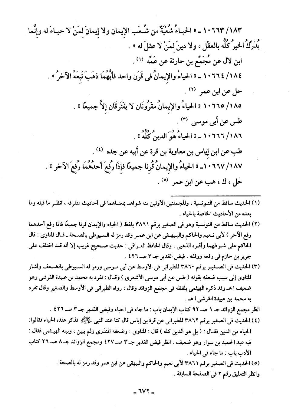 185/ 10665 - "الحياءُ والإيِمانُ مقْرُونَان لا يفْتَرقَان إِلا جميعًا".