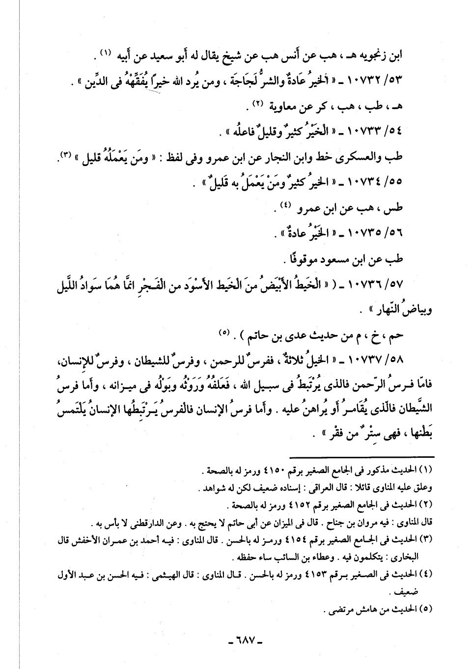 58/ 10737 - "الخيلُ ثلاثةٌ، ففرسٌ للرحمن، وفرسٌ للشيطان، وفرسٌ للإِنسان، فأمّا فرسُ الرّحمن فالذي يُرْتَبطُ في سبيل الله، فعَلفُهُ وَرَوْثُه وبَوْلُه في ميزانه، وأَما فرسُ الشَّيطان فالذي يُقَامرُ أو يُراهنُ عليه. وأما فرسُ الإنسان فالفرسُ يَرْتَبِطُها الإنسانُ يَلتَمسُ بَطنها، فهي سِتْرٌ من فقْر".