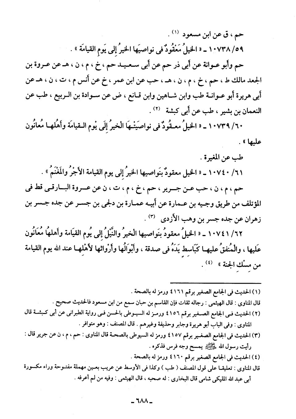 62/ 10741 - "الخيلُ معقودُ بنواصيها الخيرُ والنَّيلُ إِلى يُوم القيَامة وأَهلهُا مُعَانُون عَليها، والمُنفقُ عليها كَبَاسِطٍ يَدَهُ في صدقة، وأَبْوَالُها وأرْواثها لأهْلِها عند الله يوم القيامة من مِسْكِ الجنة" (¬4).