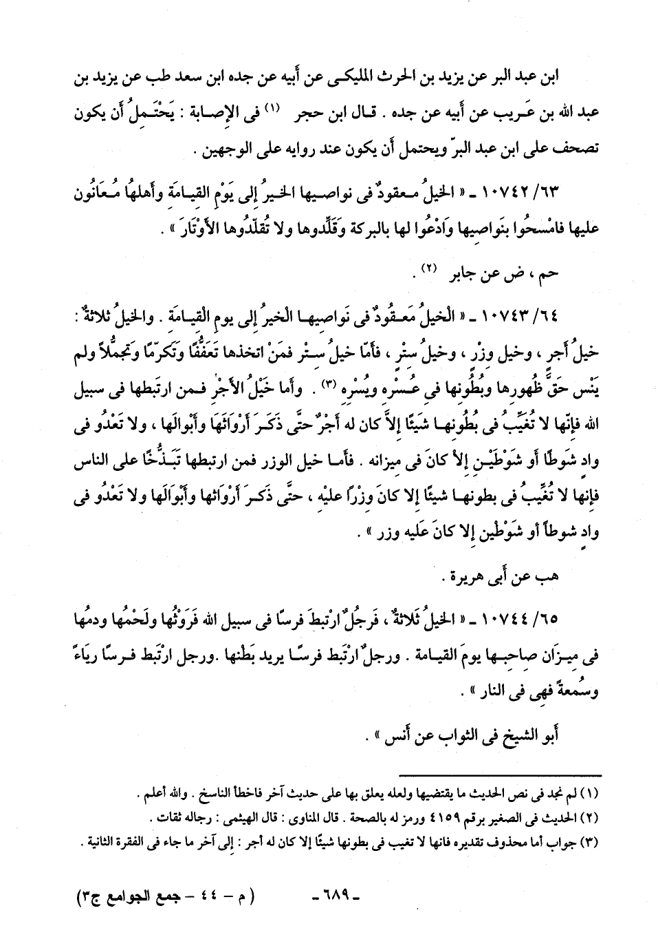 63/ 10742 - "الخيلُ معقودٌ في نواصيها الخيرُ إِلى يَوْم القِيامَة وأهلهُا مُعَانُون عليها فامْسحُوا بنَواصِيها وَادْعُوا لها بالبركة وَقَلِّدوها ولا تُقلّدُوها الأوْتَارَ".