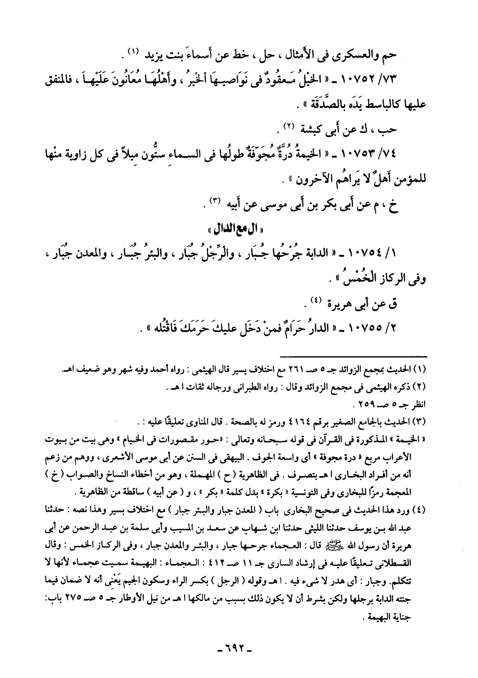 1/ 10754 - " الدابة جُرْحُها جُبَار، والرِّجْلُ جُبَار، والبئرُ جُبَار، والمعدن جُبَار، وفي الركاز الخُمْسُ".