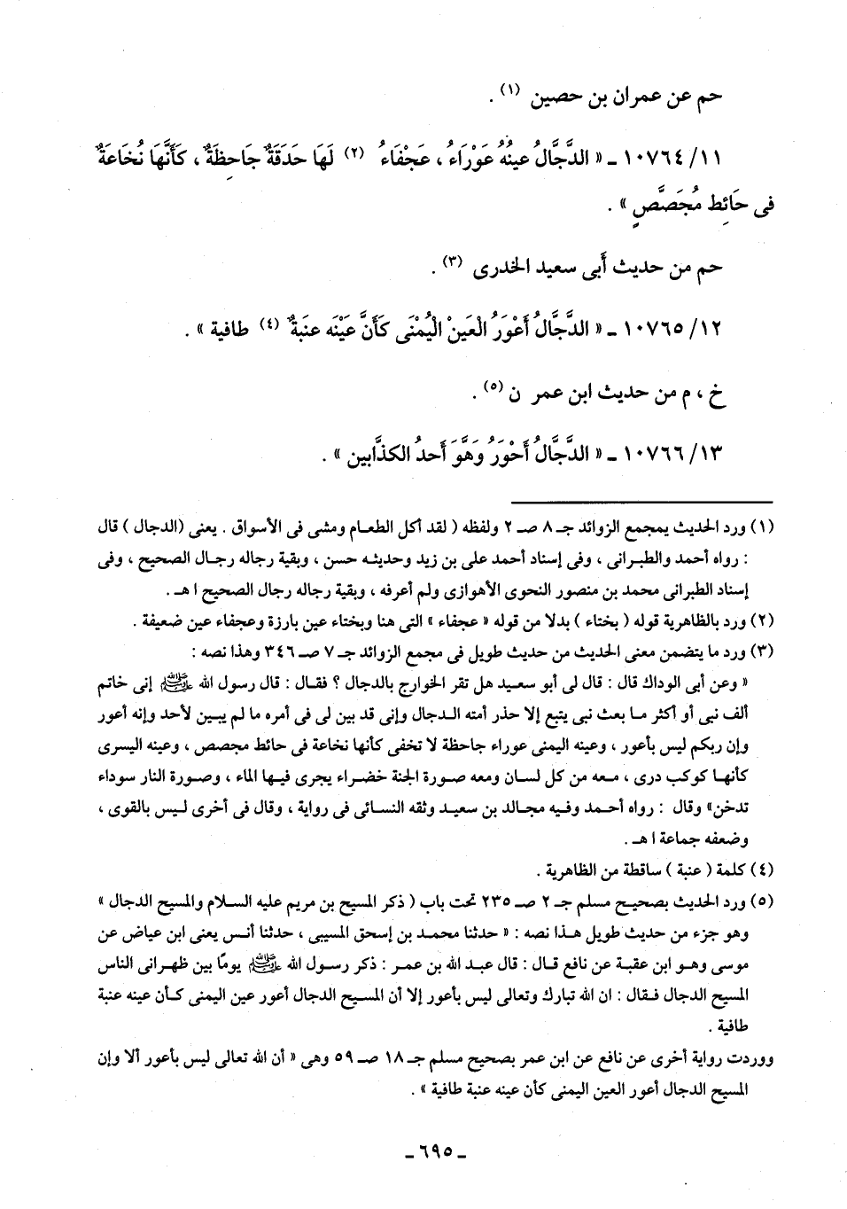 (¬1) ورد الحديث بمجمع الزوائد جـ 8 صـ 2 ولفظه (لقد أكل الطعام ومشى في الأسواق. يعني (الدجال) قال: رواه أحمد والطبراني، وفي اسناد أحمد علي بن زيد وحديثه حسن، وبقية رجاله رجال الصحيح، وفي إسناد الطبراني محمد بن منصور النحوي الأهوازى ولم أعرفه، وبقية رجاله رجال الصحيح اهـ.