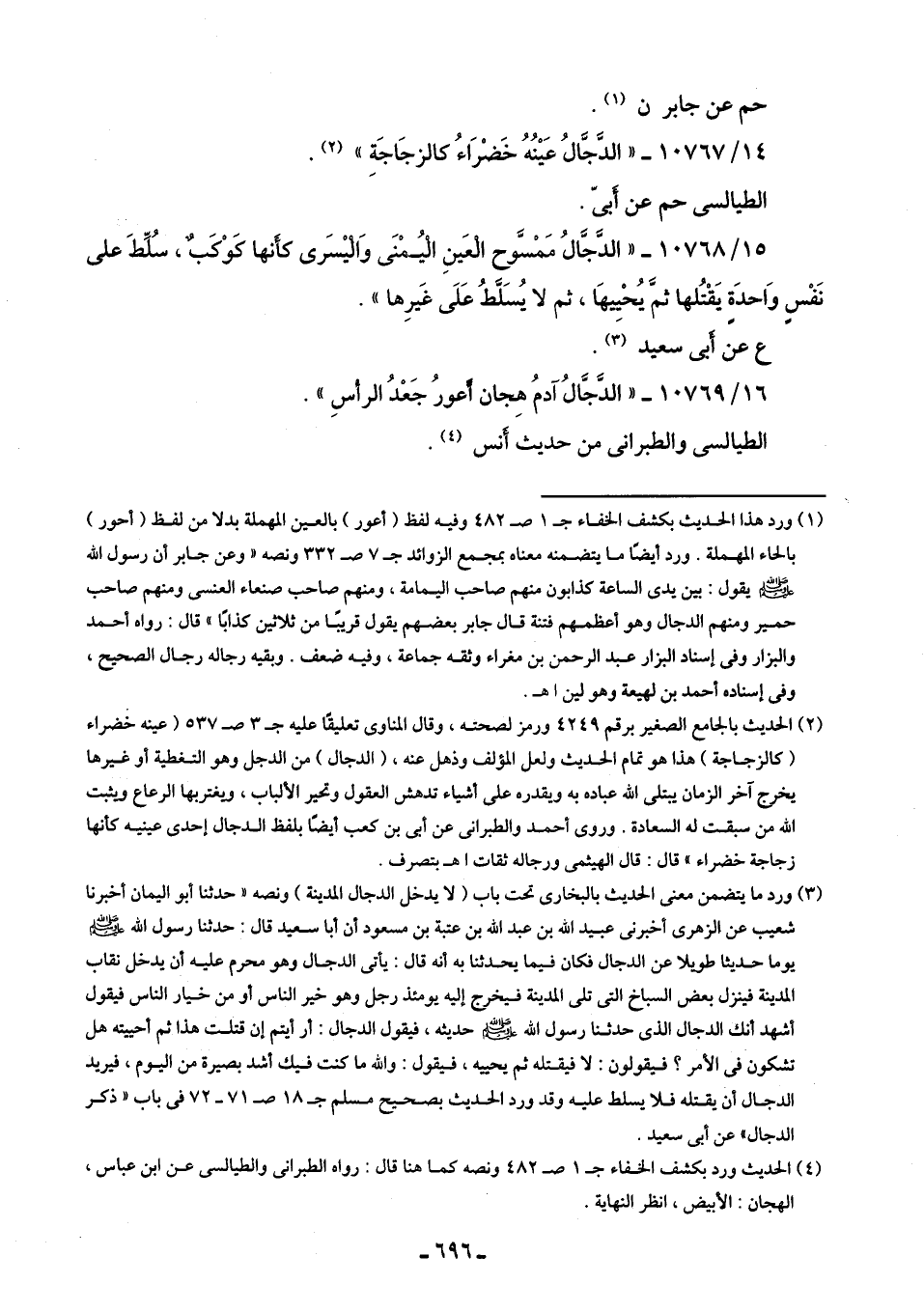 (¬2) الحديث بالجامع الصغير برقم 4249 ورمز لصحته، وقال المناوى تعليقًا عليه جـ 3 صـ 537 (عينه خضراء (كالزجاجة) هذا هو تمام الحديث ولعل المؤلف وذهل عنه، (الدجال) من الدجل وهو التغطية أو غيرها يخرج آخر الزمان يبتلى الله عباده به ويقدره على أشياء تدهش العقول وتحير الألباب، ويغتربها الرعاع ويثبت الله من سبقت له السعادة. وروى أحمد والطبراني عن أبي بن كعب أيضًا بلفظ الدجال إحدى عينيه كأنها زجاجة خضراء" قال: قال الهيثمي ورجاله ثقات اهـ بتصرف.