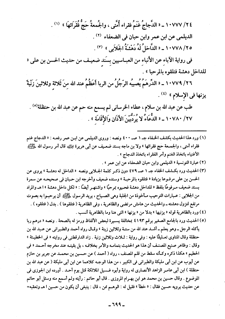 (¬1) ورد هذا الحديث بكشف الخفاء جـ 1 صـ 400 ونصه: وروى الديلمى عن ابن عمر رفعه: "الدجاج غنم فقراء أمتى، والجمعة حج فقرائها" ولابن ماجه بسند ضعيف عن أبي هريرة - رضي الله عنه - قال أمر رسول الله - صلى الله عليه وسلم - الأغنياء باتخاذ الغنم وأمر الفقراء باتخاذ الدجاج".
