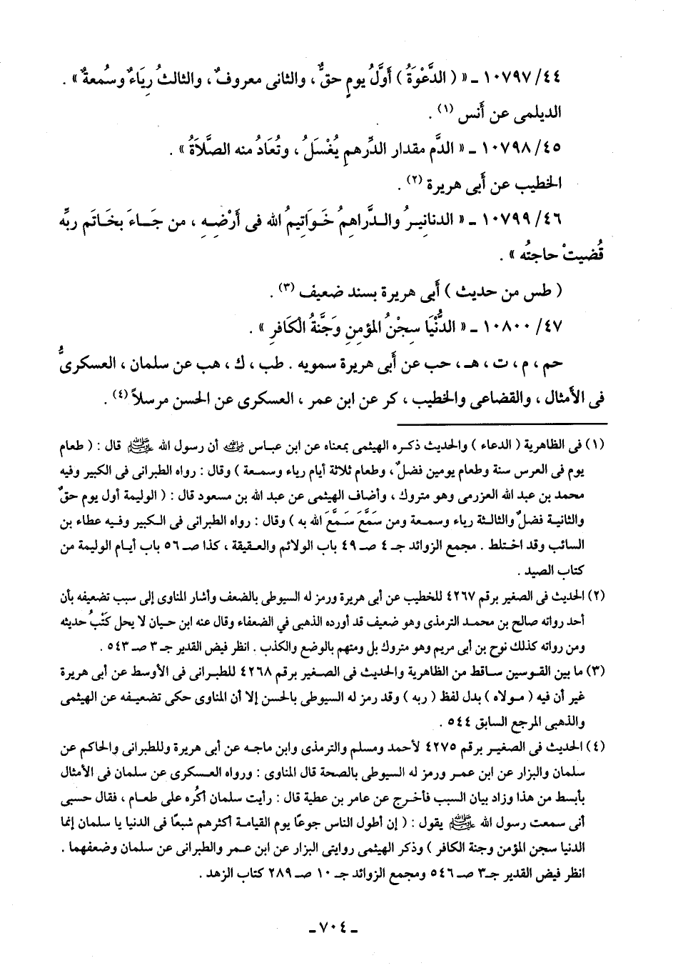(¬4) الحديث في الصغير برقم 4275 لأحمد ومسلم والترمذي وابن ماجه عن أبي هريرة وللطبرانى والحاكم عن سلمان والبزار عن ابن عمر ورمز له الشوطى بالصحة قال المناوى: ورواه العسكرى عن سلمان في الأمثال بأبسط من هذا وزاد بيان السبب فأخرج عن عامر بن عطية قال: رأيت سلمان أُكره على طعام، فقال حسبى أنى سمعت رسول الله - صلى الله عليه وسلم - يقول: (إن أطول الناس جوعًا يوم القيامة أكثرهم شبعًا في الدنيا يا سلمان إنما الدنيا سجن المؤمن وجنة الكافر) وذكر الهيثمي روايتى البزار عن ابن عمر والطبراني عن سلمان وضعفهما.