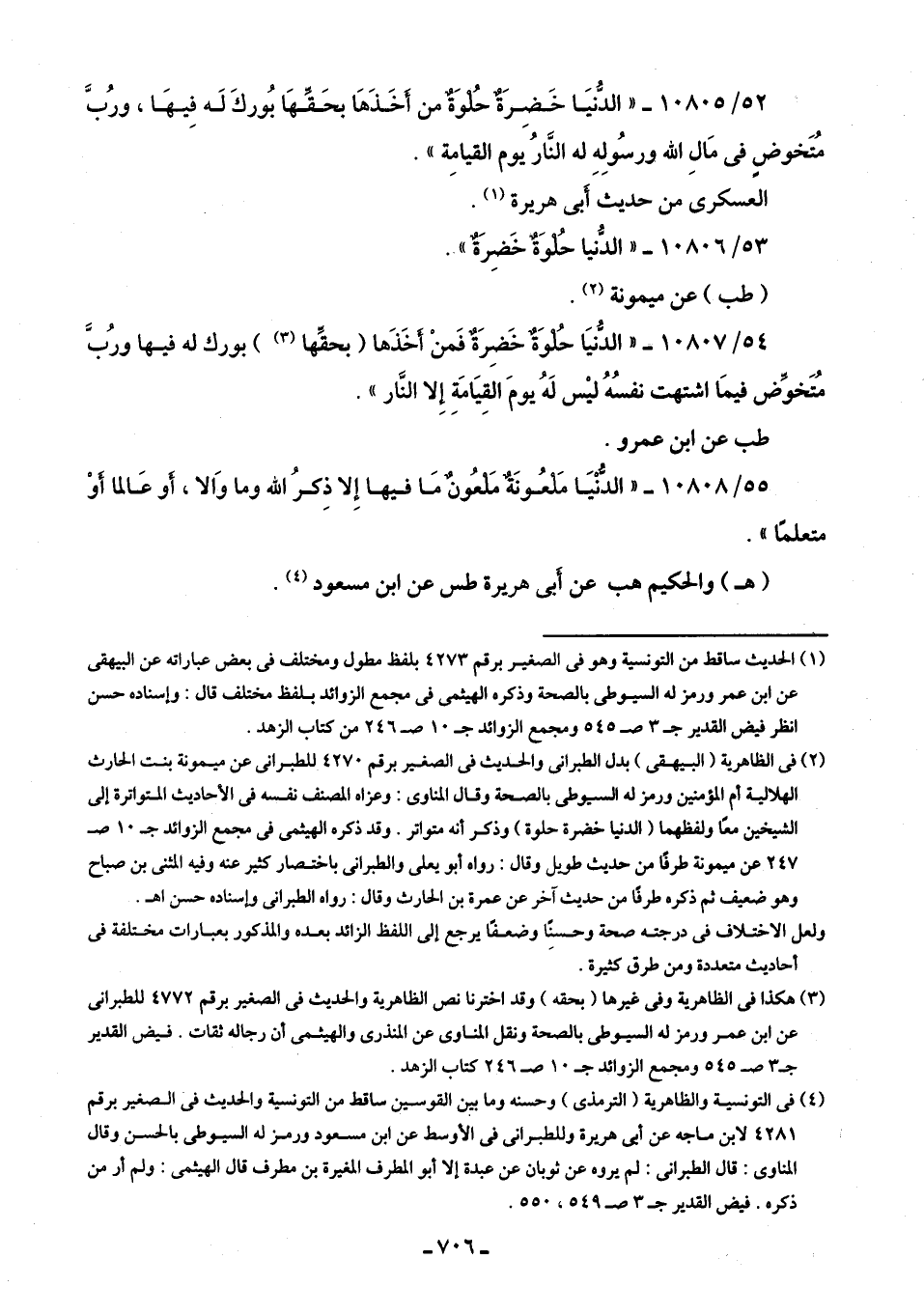 52/ 10805 - "الدُّنيَا خَضِرَةٌ حُلوَةٌ من أخَذَهَا بحَقِّهَا بُوركَ لَه فِيهَا، ورُبَّ مُتَخوضٍ في مَالِ الله ورسُولِهِ له النَّارُ يوم القيامة".